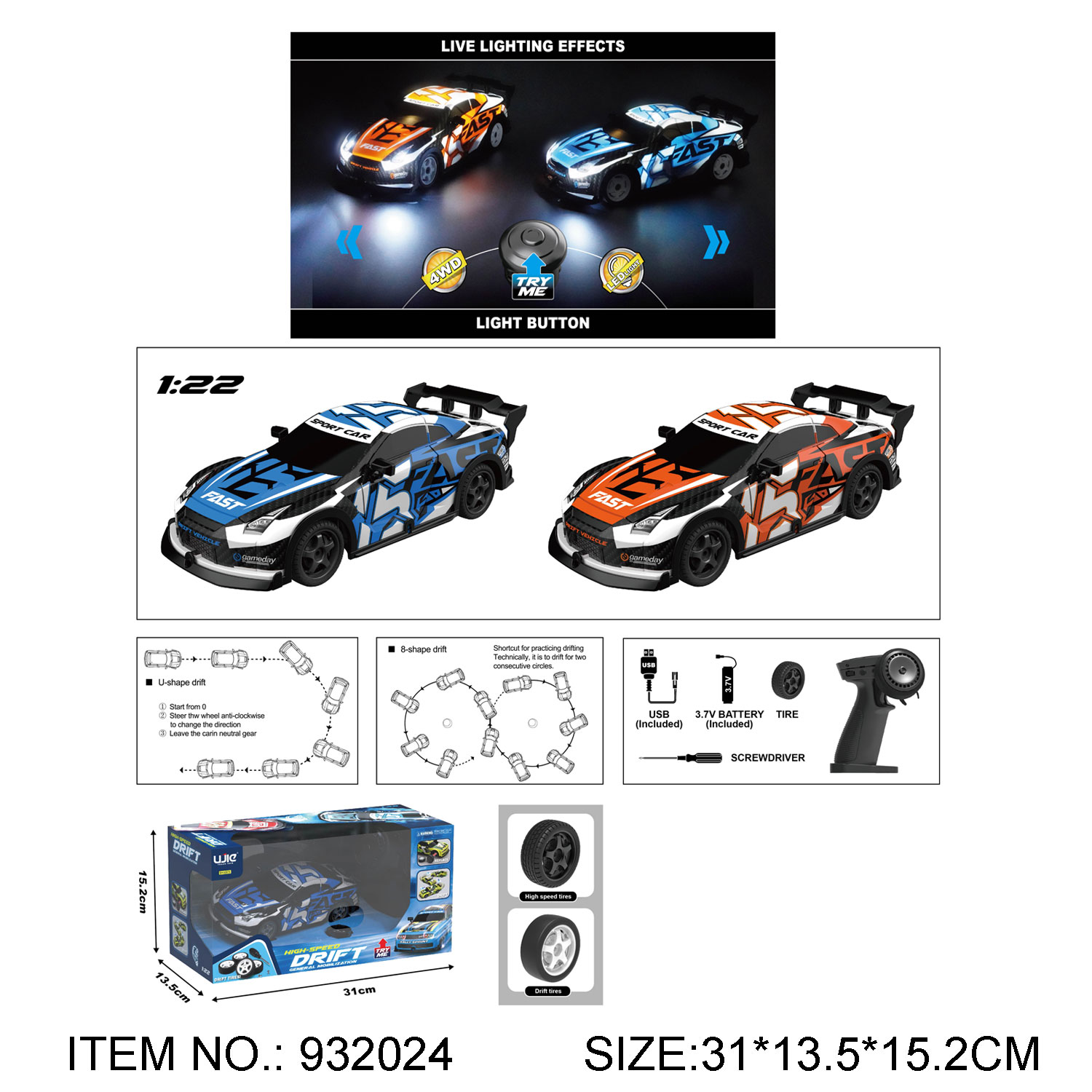 1:18 2.4G R-C CAR PLAYSET WITH LIGHTS(CAR  USE 3.7V INCLUDED+USB,CONTROLLER USE 2 PCS AA NOT INCLUDED,TRY ME USE 3 PCS AG13 INCLUDED),TEST REPORTS:EN71 PART1-2-3 / PHTHALATE TEST / EN62115 / ASTM / HR4040 / PASH / CD / GCC.