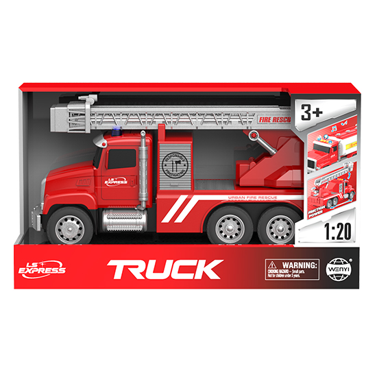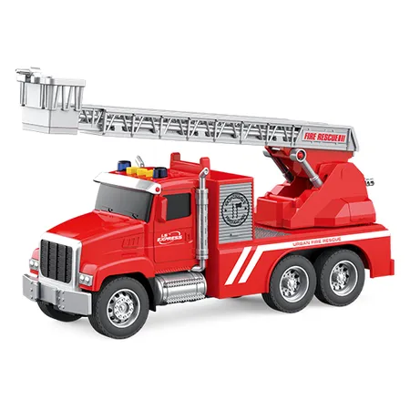 Fire truck with light and sound function.1:20 simulated design.Ladders can be extended.Friction driving.