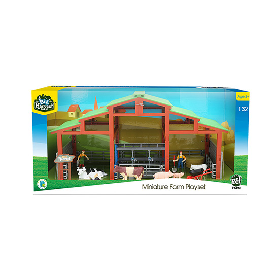 1 steel framed house, 1 milk station, 1 farm sign, 1 wheel barrow, 1 round bale, 2 farmers, 2 pigs, 2 cows, 1 sheep