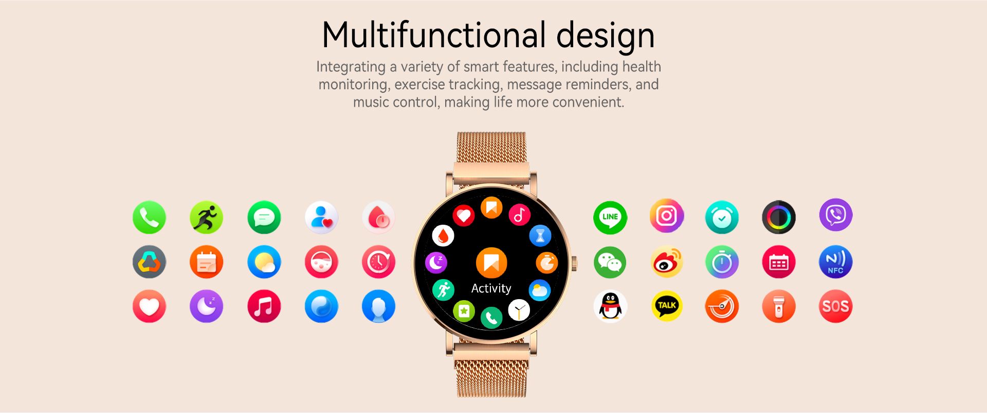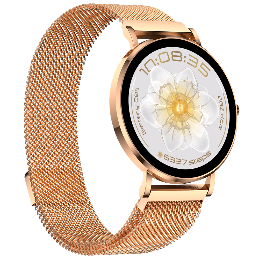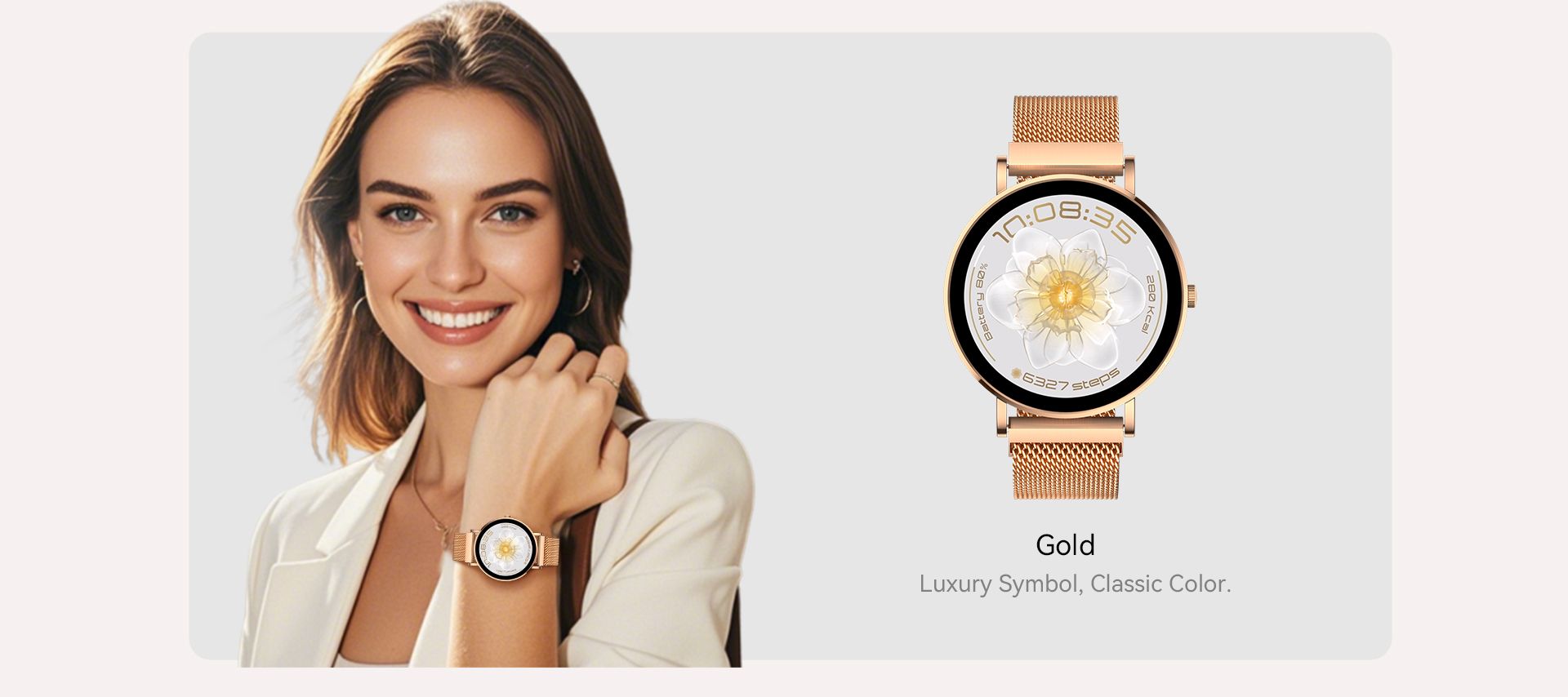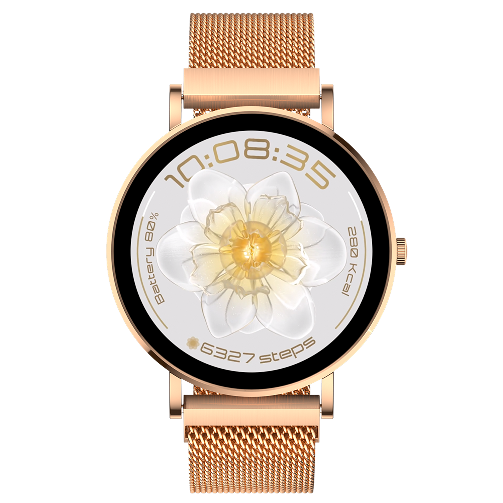 | Materials | Zinc Alloy + IML | Female AMOLED ROUND, with side rotary switch • One-Pair BT calling, Voice Assistance • 100+ sports modes • Health Monitor: Heart Rate, Blood Pressure,SPO2, Stress, female health, Sleep • World Time, Stock market • Multi-watchface + Cloud watch faces+DIY watch faces • Smart Reminder: SMS, Social Media Notification, Calling, Sedentery, Aalrm • Mutil-language, support customize language • Music Control, Camera Control, Weather, Find Phone,Stopwatch, Timer... | |