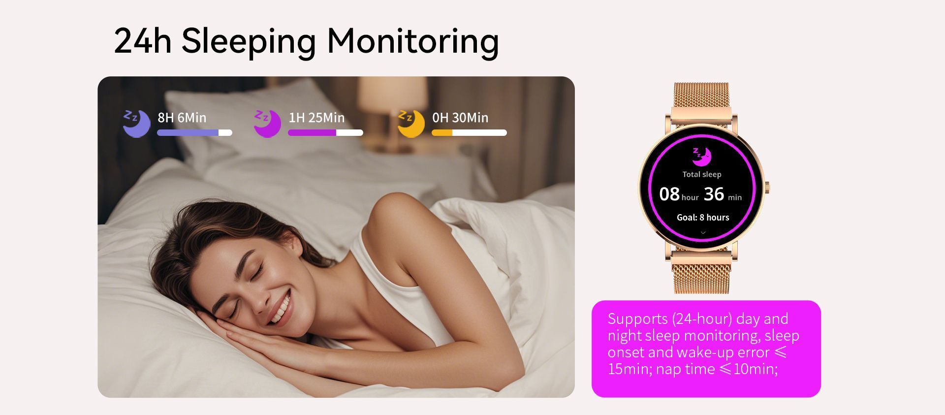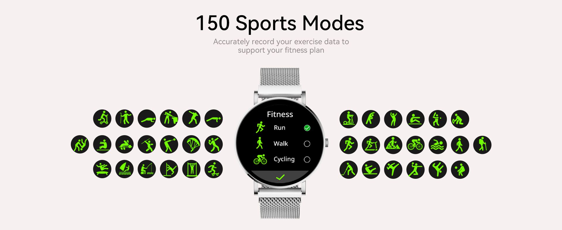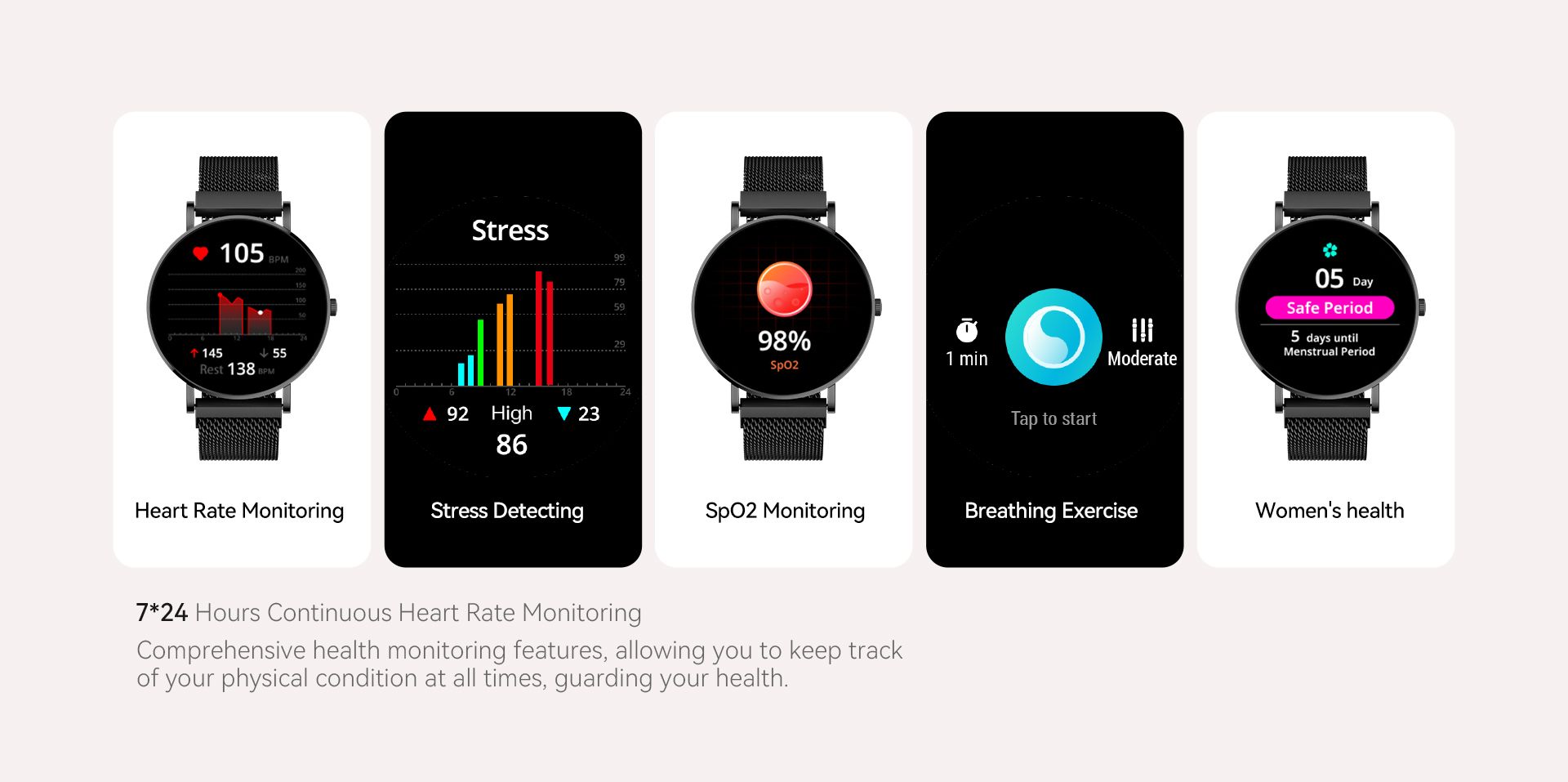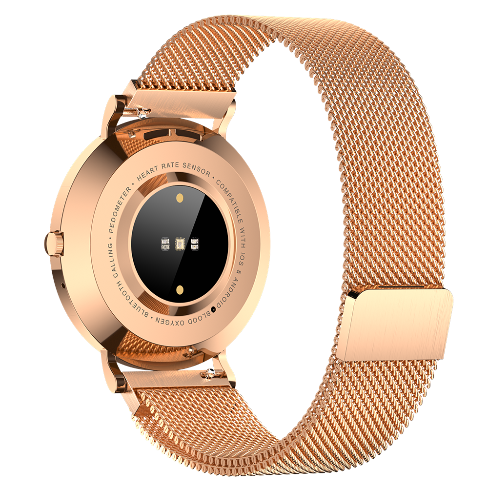 | Materials | Zinc Alloy + IML | Female AMOLED ROUND, with side rotary switch • One-Pair BT calling, Voice Assistance • 100+ sports modes • Health Monitor: Heart Rate, Blood Pressure,SPO2, Stress, female health, Sleep • World Time, Stock market • Multi-watchface + Cloud watch faces+DIY watch faces • Smart Reminder: SMS, Social Media Notification, Calling, Sedentery, Aalrm • Mutil-language, support customize language • Music Control, Camera Control, Weather, Find Phone,Stopwatch, Timer... | |