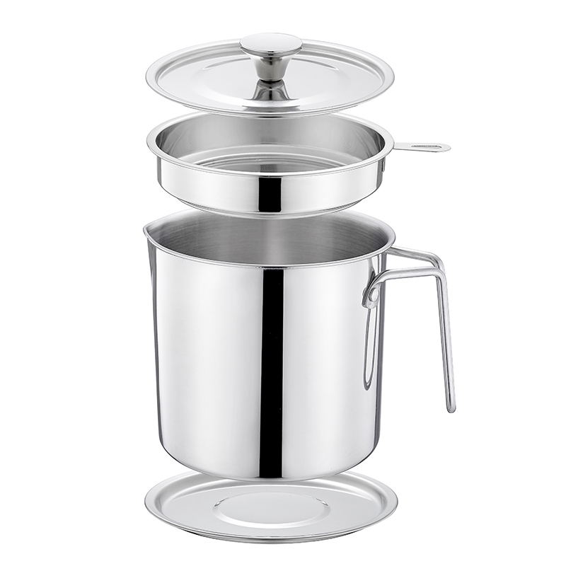 A 1.3L/46 oz bacon grease container with strainer. It is a 4pcs item (cup + lid + strainer + base). We can make it 3 pcs also ( remove the base).