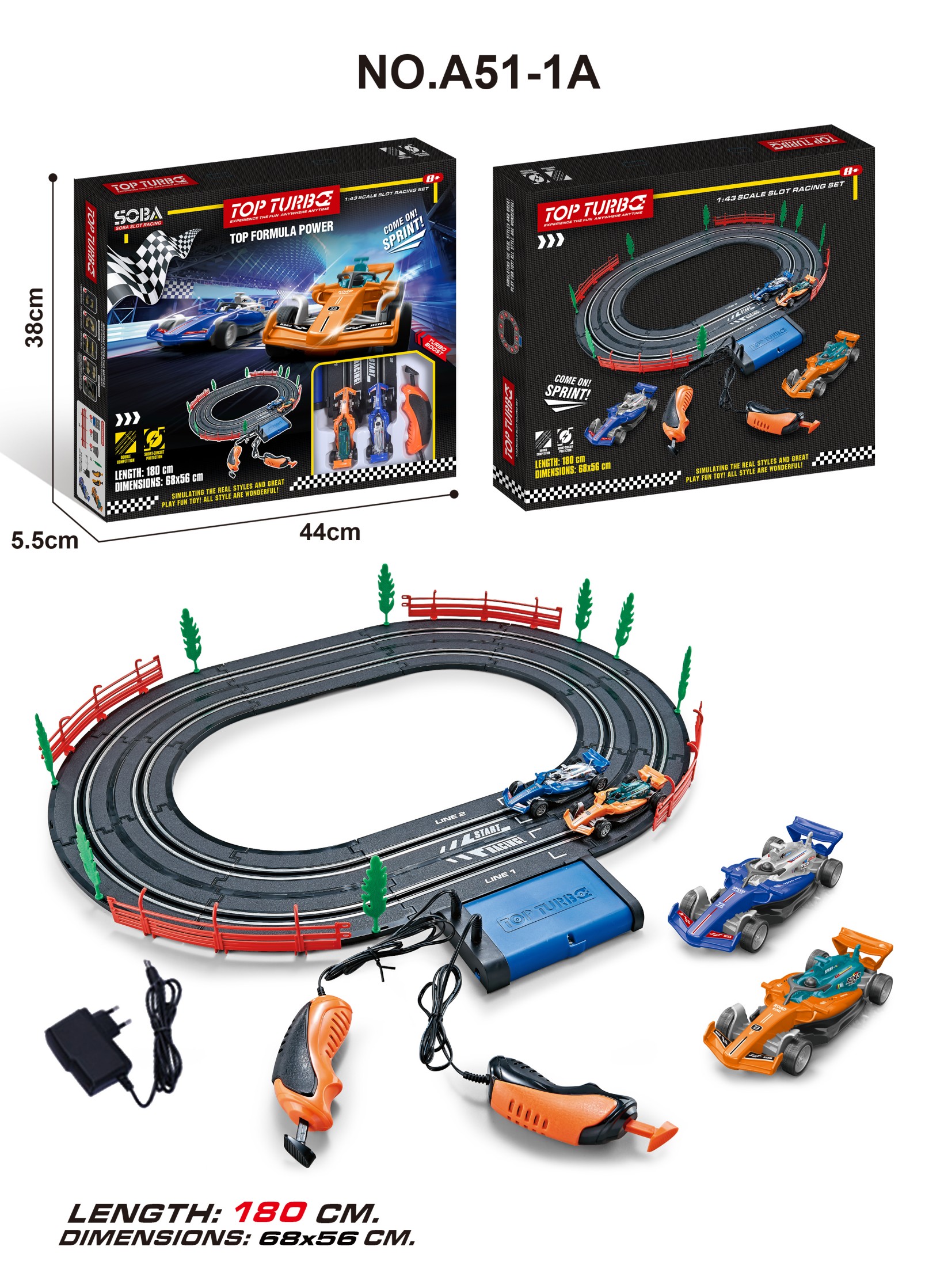 Contents: 2x F1 racing cars, 2x wired remote controllers, 1 set xtracks, 1x 12V adapter, 1 set x scene decorations.