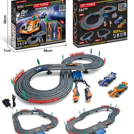 Contents: 2 xF1 racing cars, 2x wired remote controllers, 1 set x tracks, 1x 12V adapter, 1 set x scene decorations.