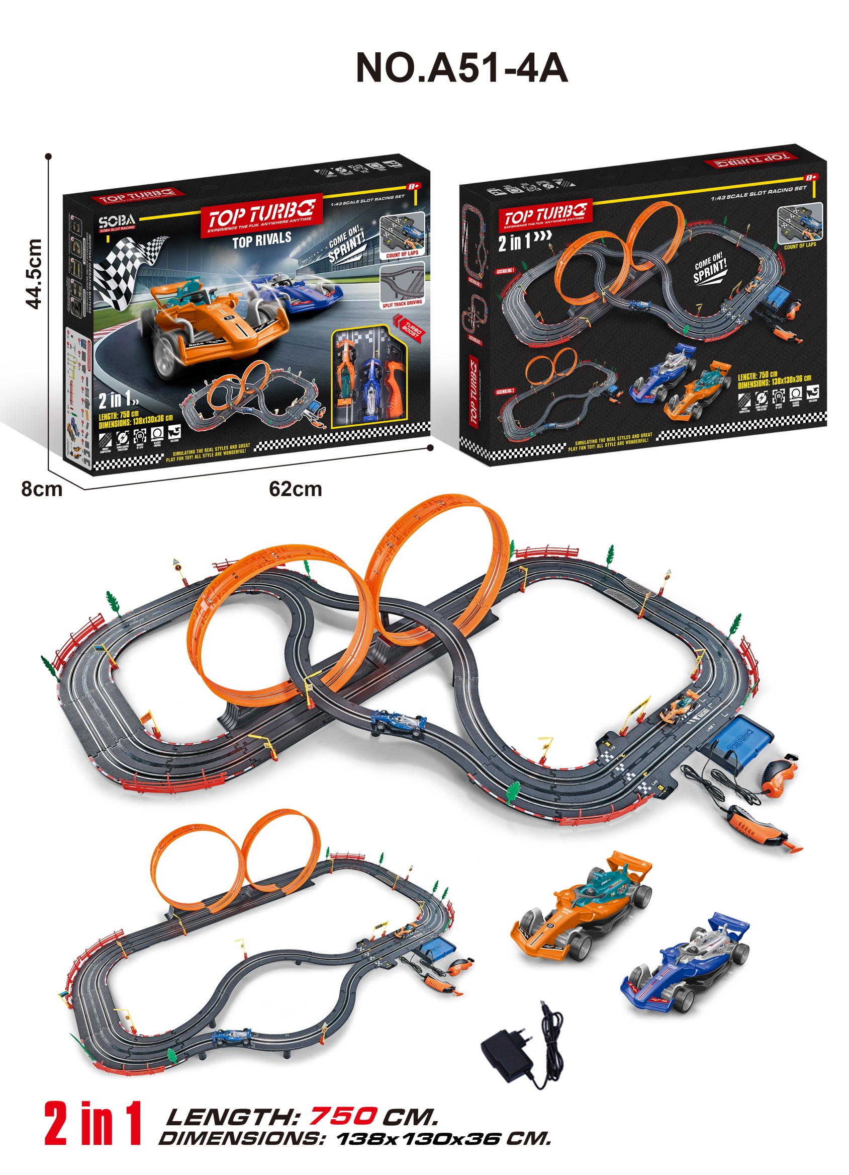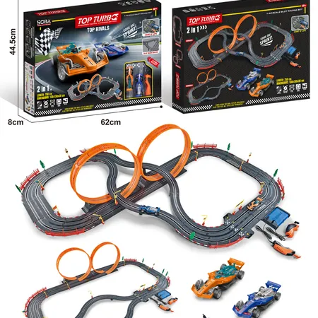 Contents: 2x F1 racing cars, 2x wired remote controllers, 1 set x tracks, 1x 12V adapter, 1 set x scene decorations.