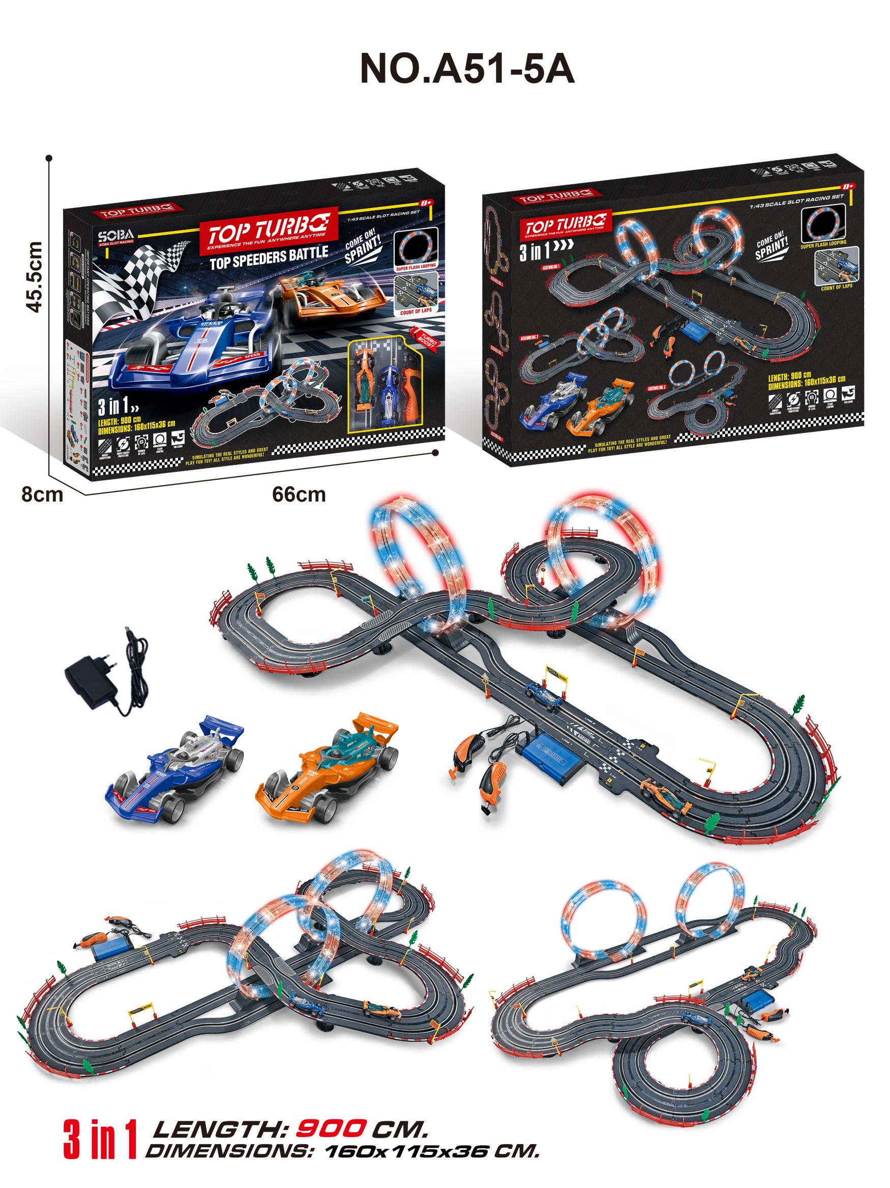Track length: 9 meters. Track assembly size: 160 * 115 * 36 cm.