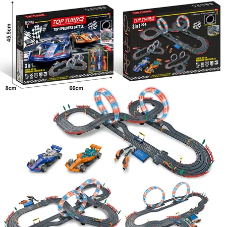 Contents: 2x F1 racing cars, 2x wired remote controllers, 1 set x tracks (with luminous components), 1x 12V adapter, 1 set x scene decorations.