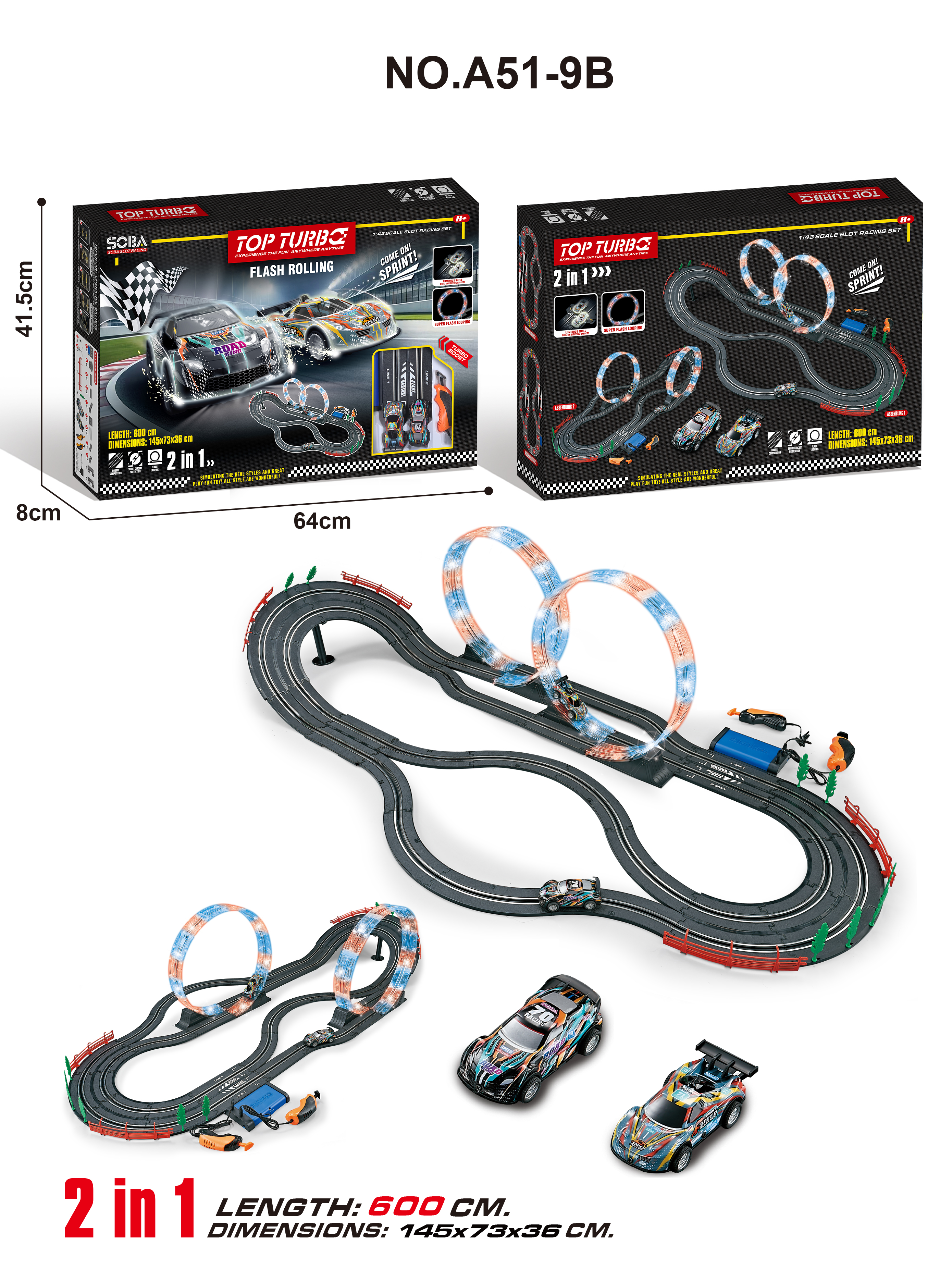 Contents: 2x luminous racing cars, 2x wired remote controllers, 1 set xtracks (with luminous components), 1 x12V adapter, 1 set x scene decorations.