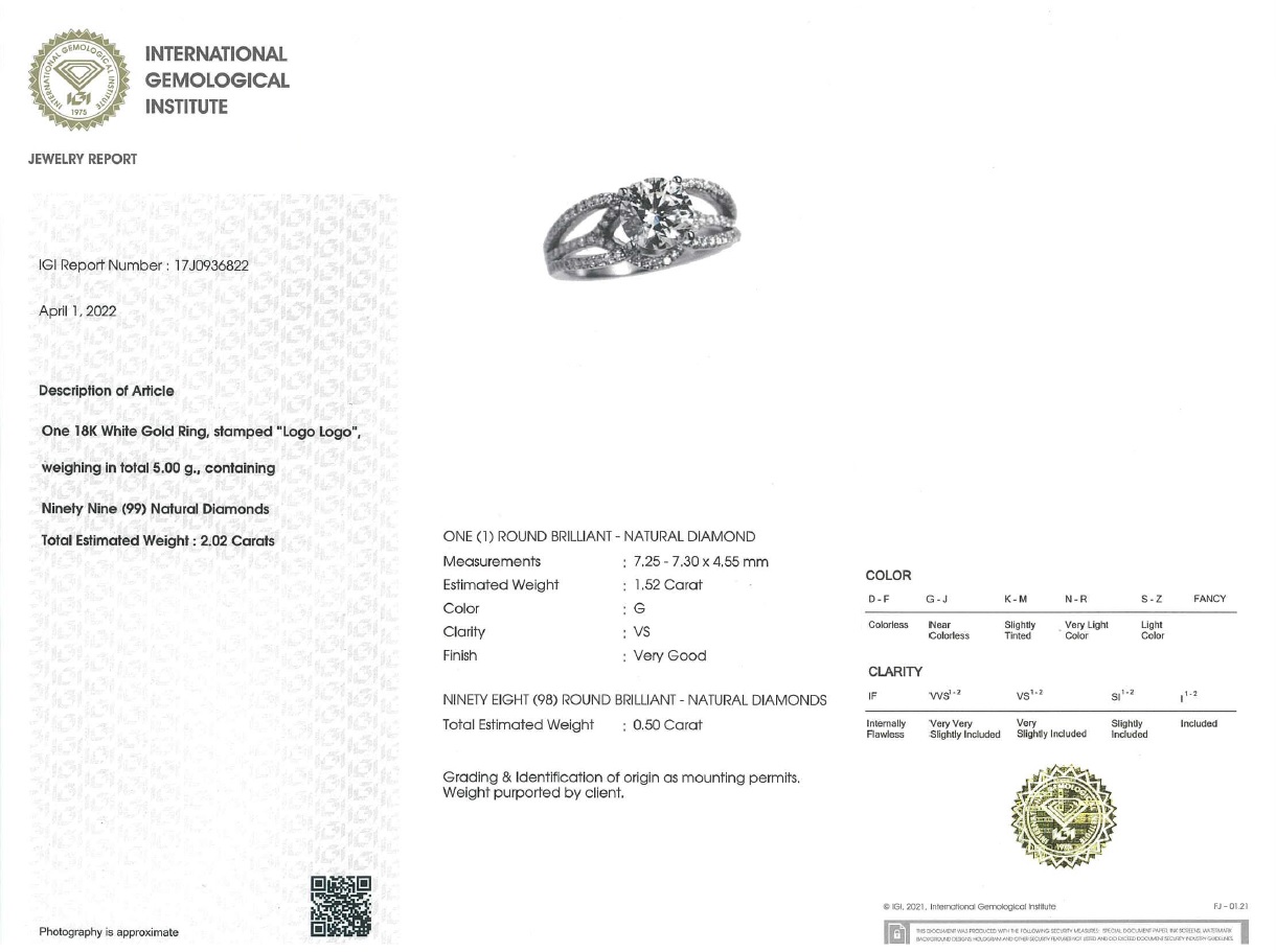18K White Gold with Round Brilliant Diamond18K Gold Weight: 4.60GramDiamond: 1pcs / 1.52caratDiamond: 98pcs / 0.50caratDiamond Specification: G Color VS
