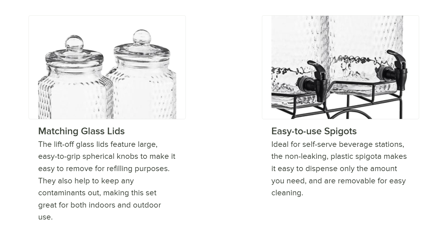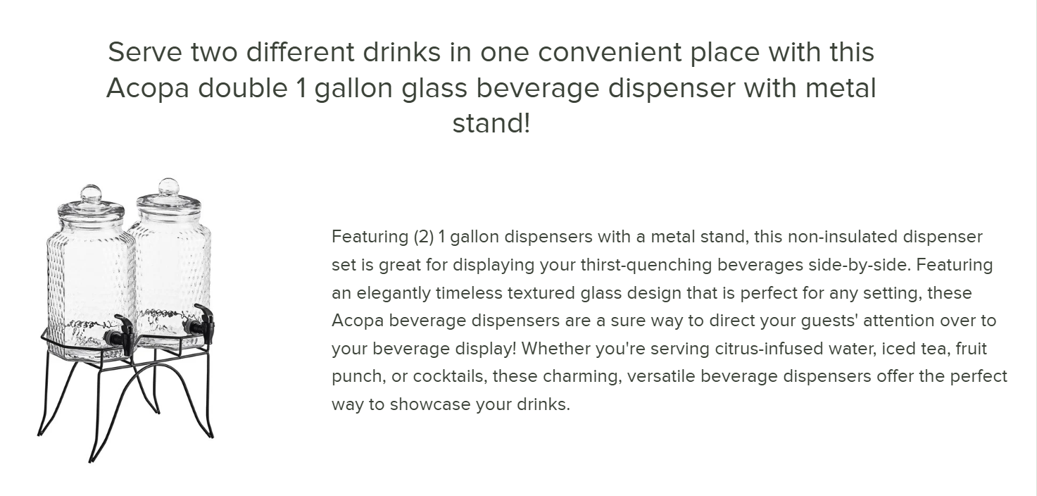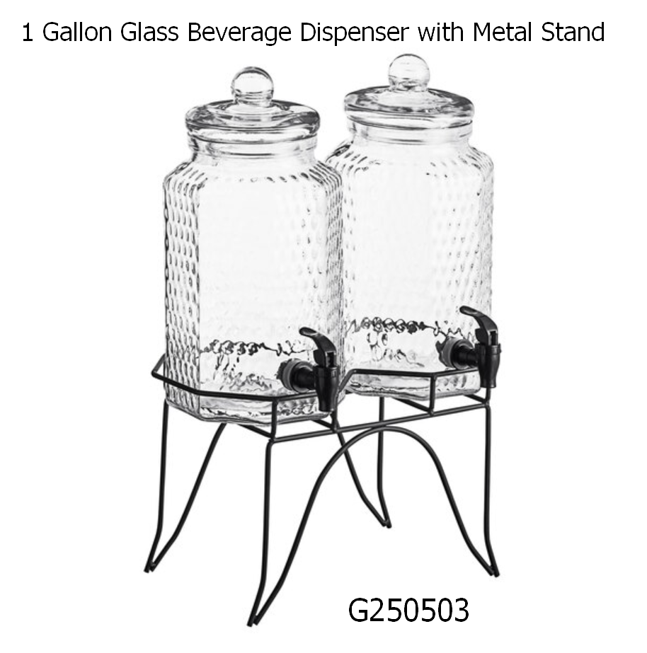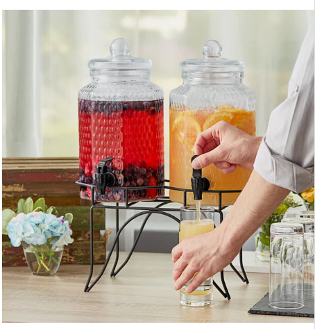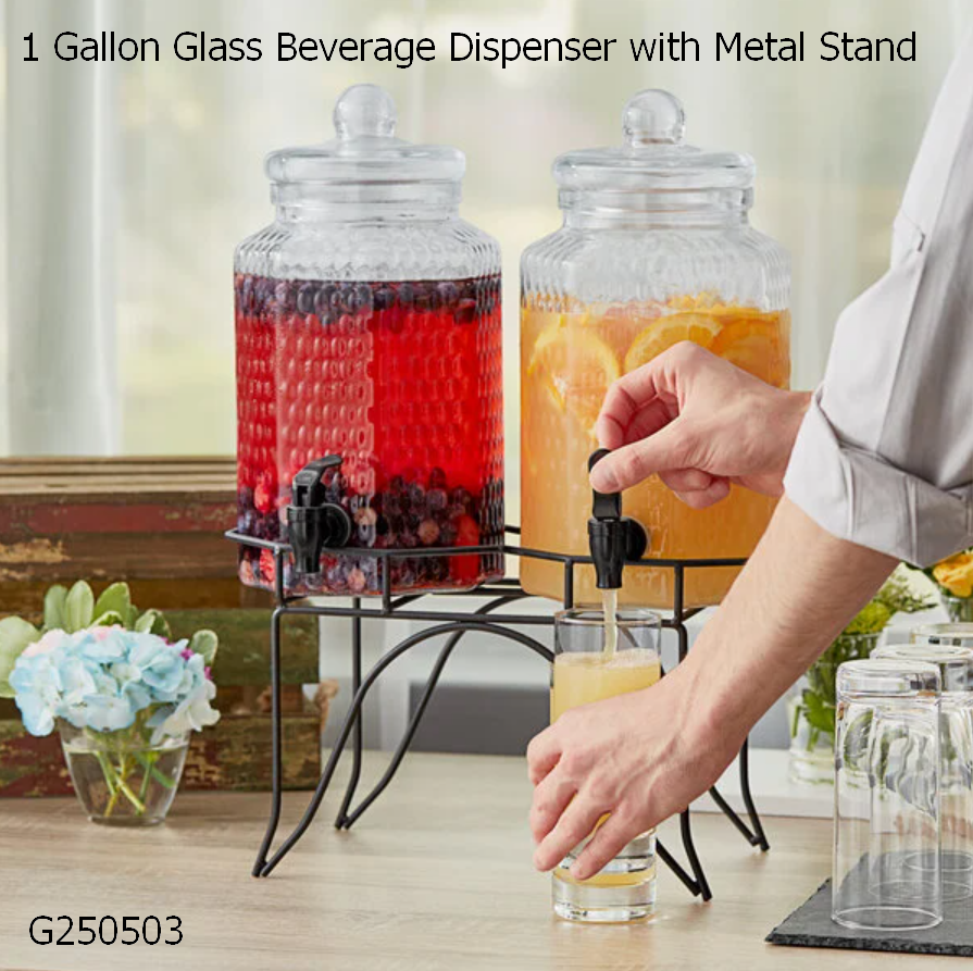 Featuring (2) 1 gallon dispensers with a metal stand, this non-insulated dispenser set is great for displaying your thirst-quenching beverages side-by-side. Featuring an elegantly timeless textured glass design that is perfect for any setting, these Acopa beverage dispensers are a sure way to direct your guests' attention over to your beverage display! Whether you're serving citrus-infused water, iced tea, fruit punch, or cocktails, these charming, versatile beverage dispensers offer the perfect way to showcase your drinks.