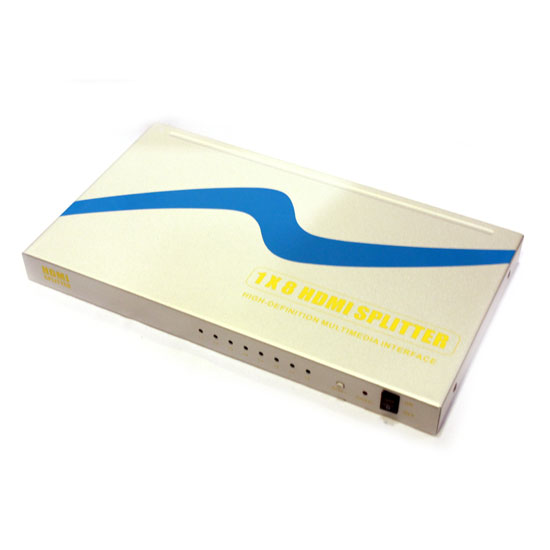 Pictured is a compact HDMI splitter designed with eight ports. The HDMI splitter is sure to give serious home theater lovers a lot of excitement. This high-quality HDMI splitter is easy to install and operate.
