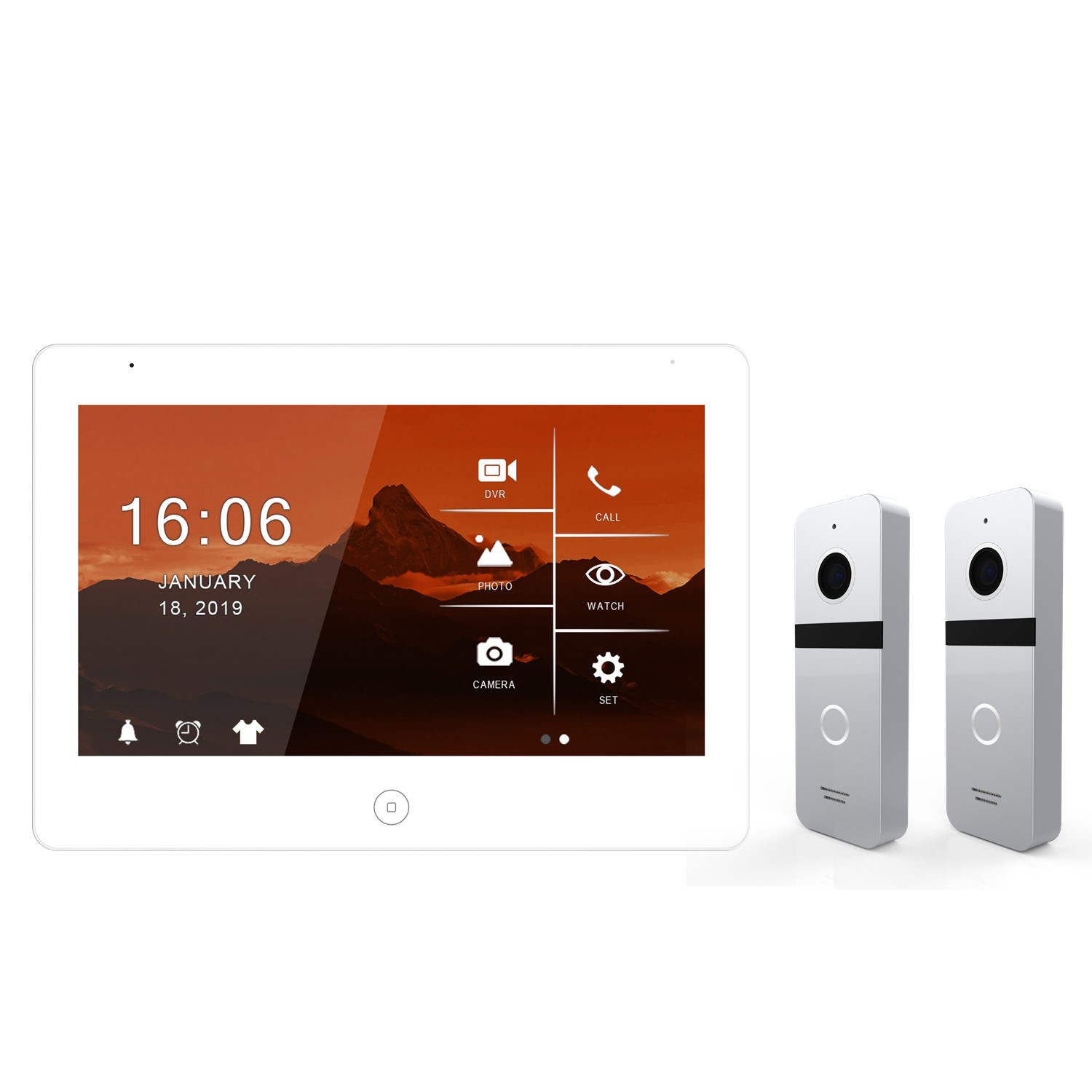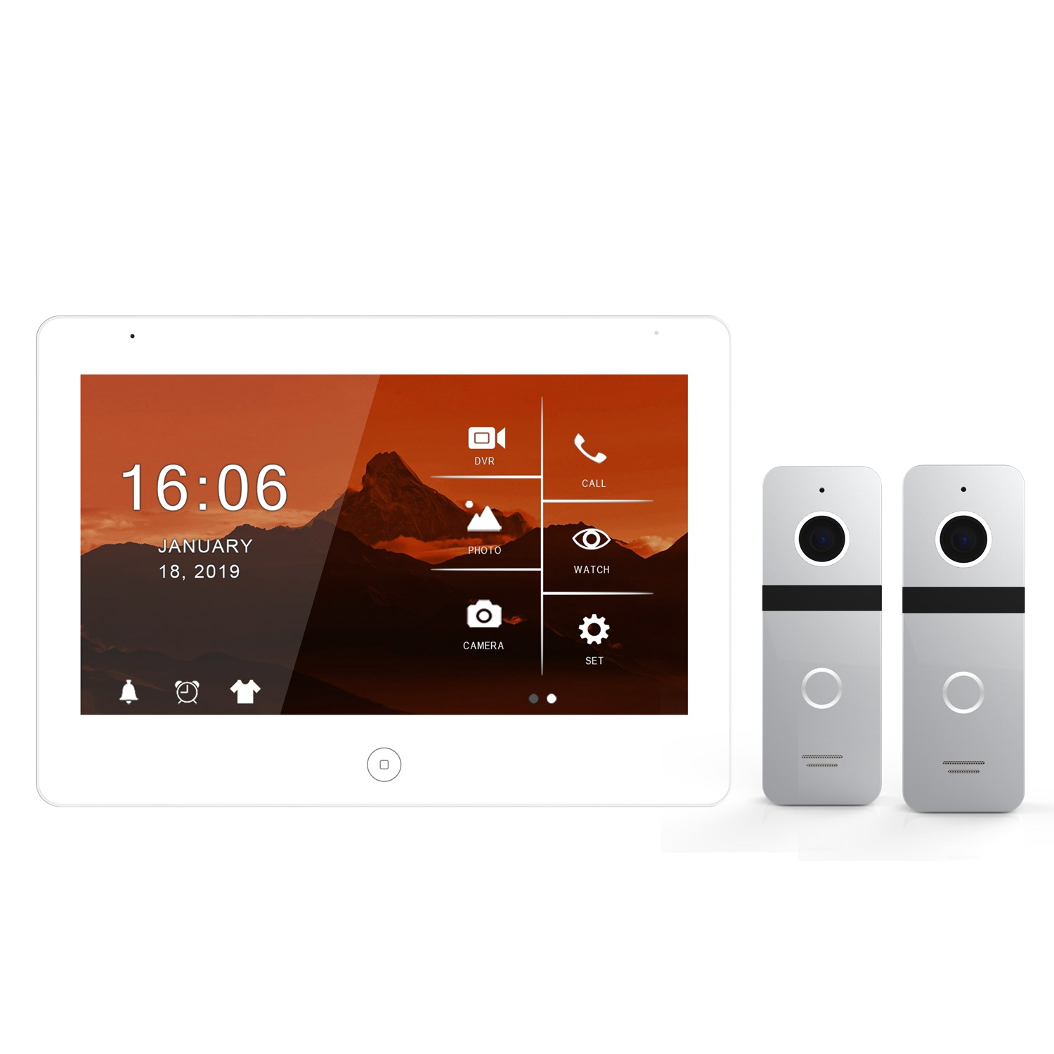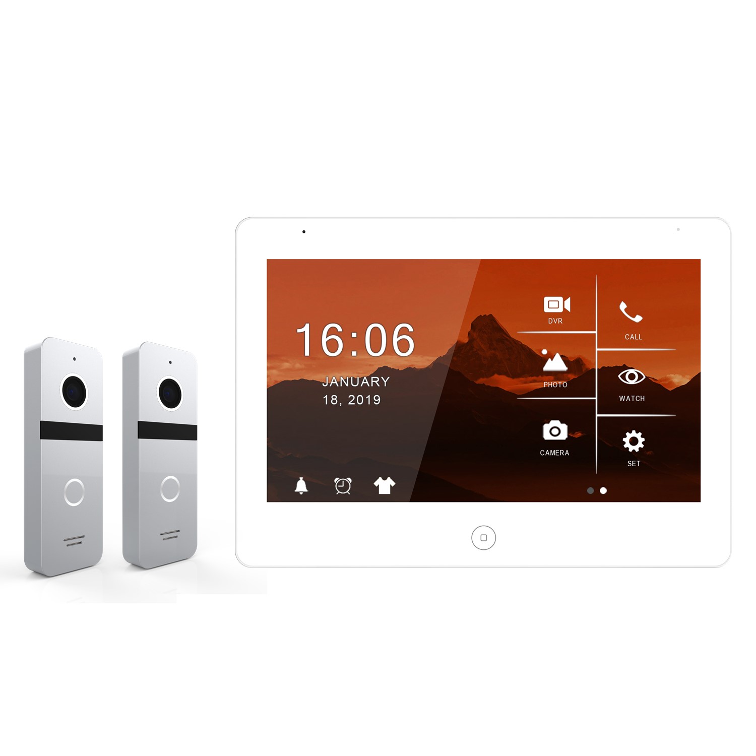 1. 2 outdoor doorbells + 4 indoor monitors + 2 CCTV cameras