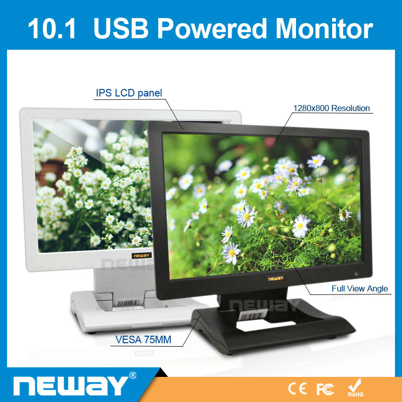 • 10.1 inch Widescreen, LED Backlight 1280x800 IPS LCD Panel, Full View Angle USB input & output Desktop Folding bracket VESA 75MM mounting holes 5-wires resistive touch panel available