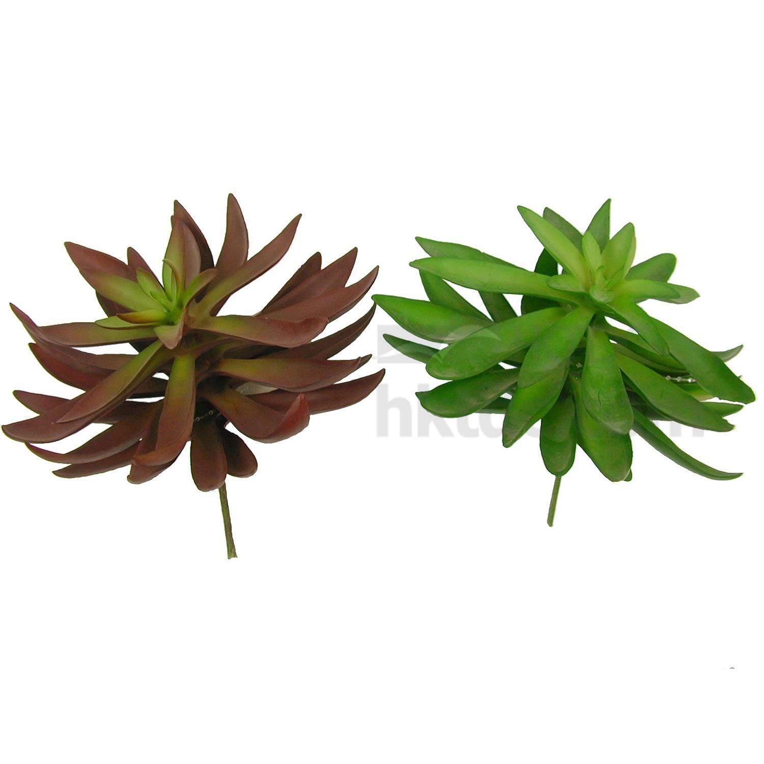 • Artificial succulent plants in various sizes, color hues and types make an excellent choice for DIY projects.  As shown is two pieces of faux aeonium succulents in green and burgundy.