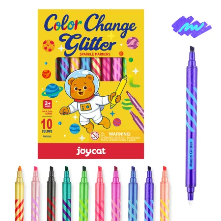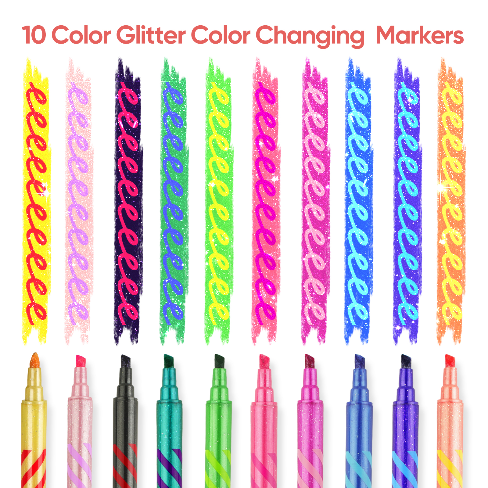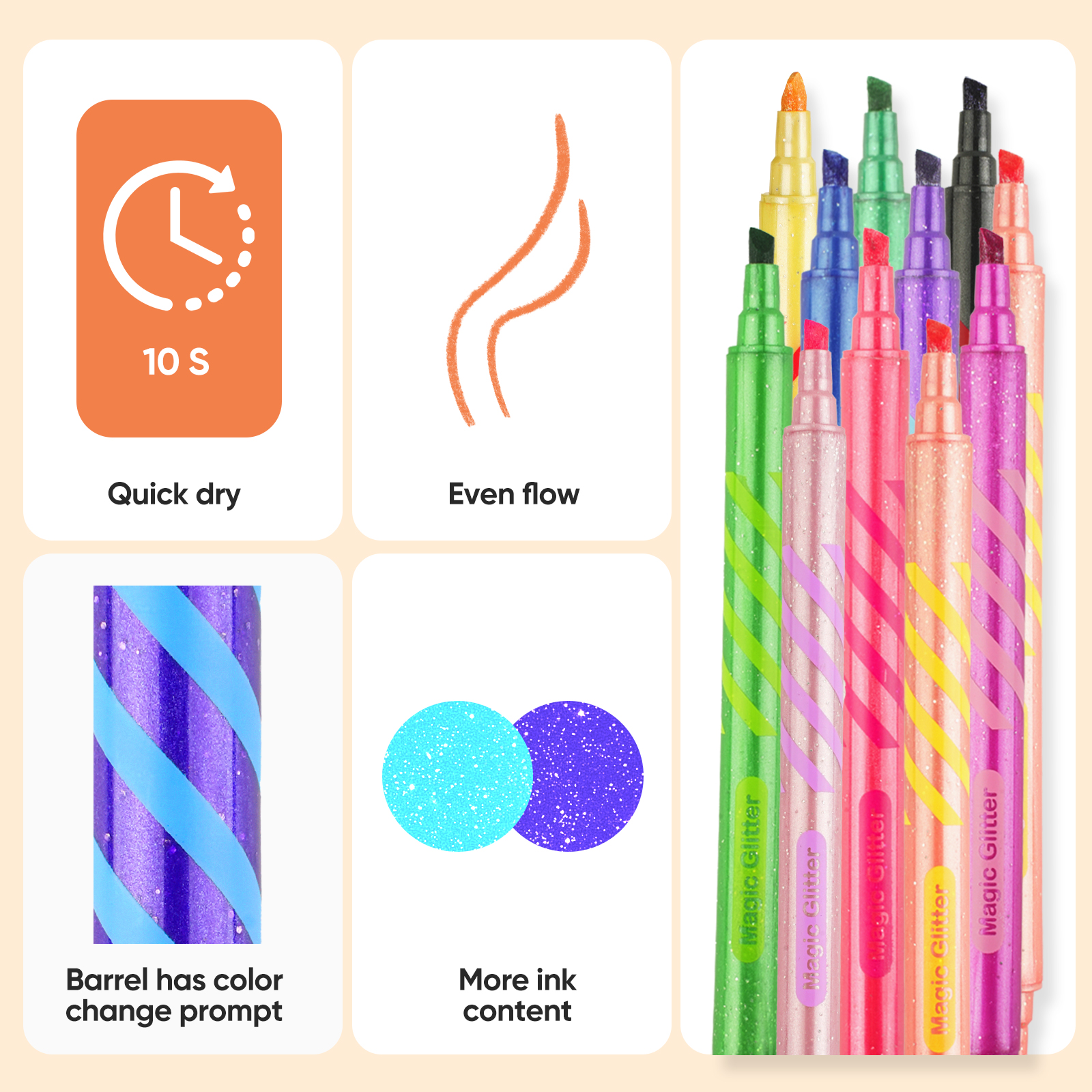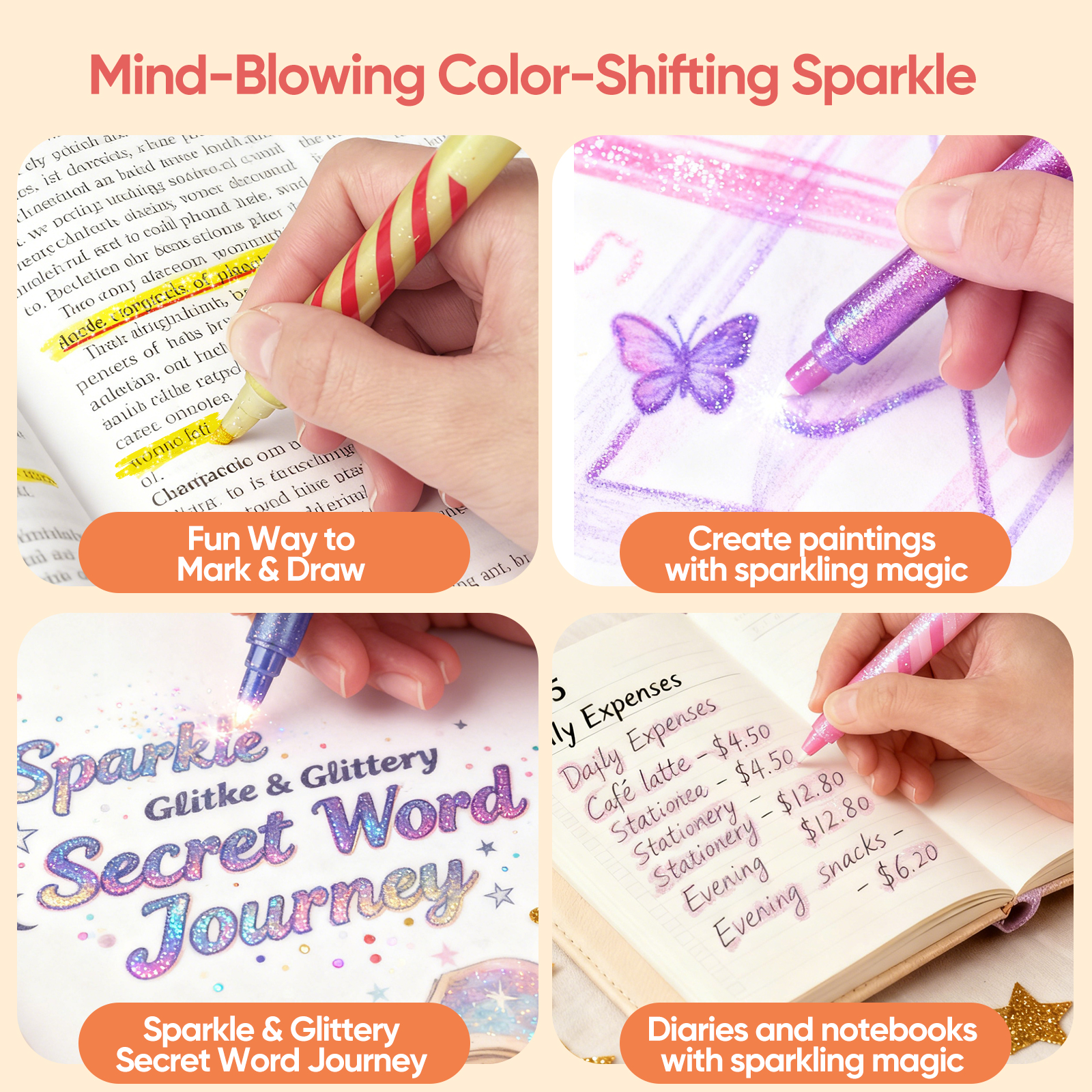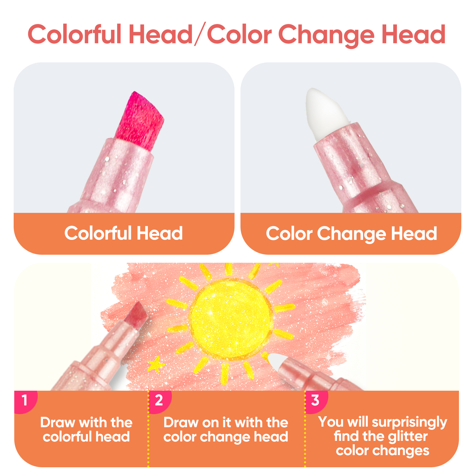 【See The Magic On The Barrel & On The Paper】 Never guess the color change again! Each marker features a clear, color-coded barrel that shows you the starting color and the magical end color (e.g., Red → Orange). Just draw with the colored chisel tip and watch the sparkle ink transform instantly with the white cone tip, creating a mesmerizing and predictable magical art experience.