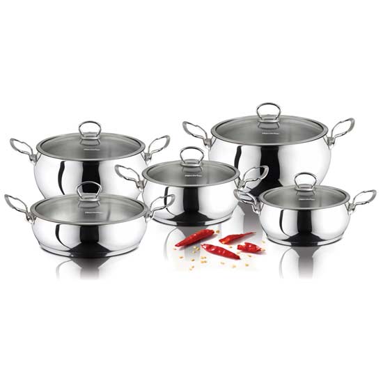 The cookware set is completed with 10 cooking pots. Each cooking pot is finely manufactured with sturdy stainless steel, offering a rugged construction while distributing heat evenly for efficient cooking. The thoughtfully designed side handles let you pick up the cooker safely with a firm grip, while the lid covers up the pot to prevent spilling. These stainless steel cooking pot are convenient pieces of kitchenware for households.