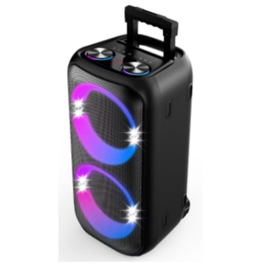 Power: Actual output of 80W (40W x 2). Specifications: 10-inch 100mm subwoofer with RGB lighting. Battery: 11.1V/6000mAh lithium battery. Features: Dual USB/TF card decoding, AUX input, FM radio, microphone, Bluetooth/TWS connectivity, voice prompts, 3 large rotary knobs, 4 large 8-inch displays, wheeled design, remote control, Type-C charging cable, and wireless microphone.