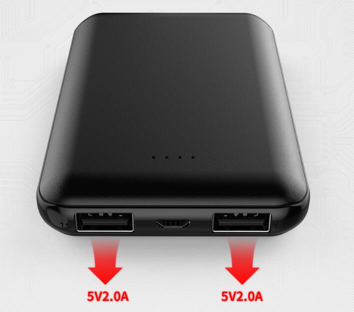 Material: ABS Color: white/black DC in: 5V/2A / MICRO/TYPE-C DC out: 5V2A Battery: 955465*2 10000mAh Dimension (mm): 94 x 64 x 23 Weight (g): 200g