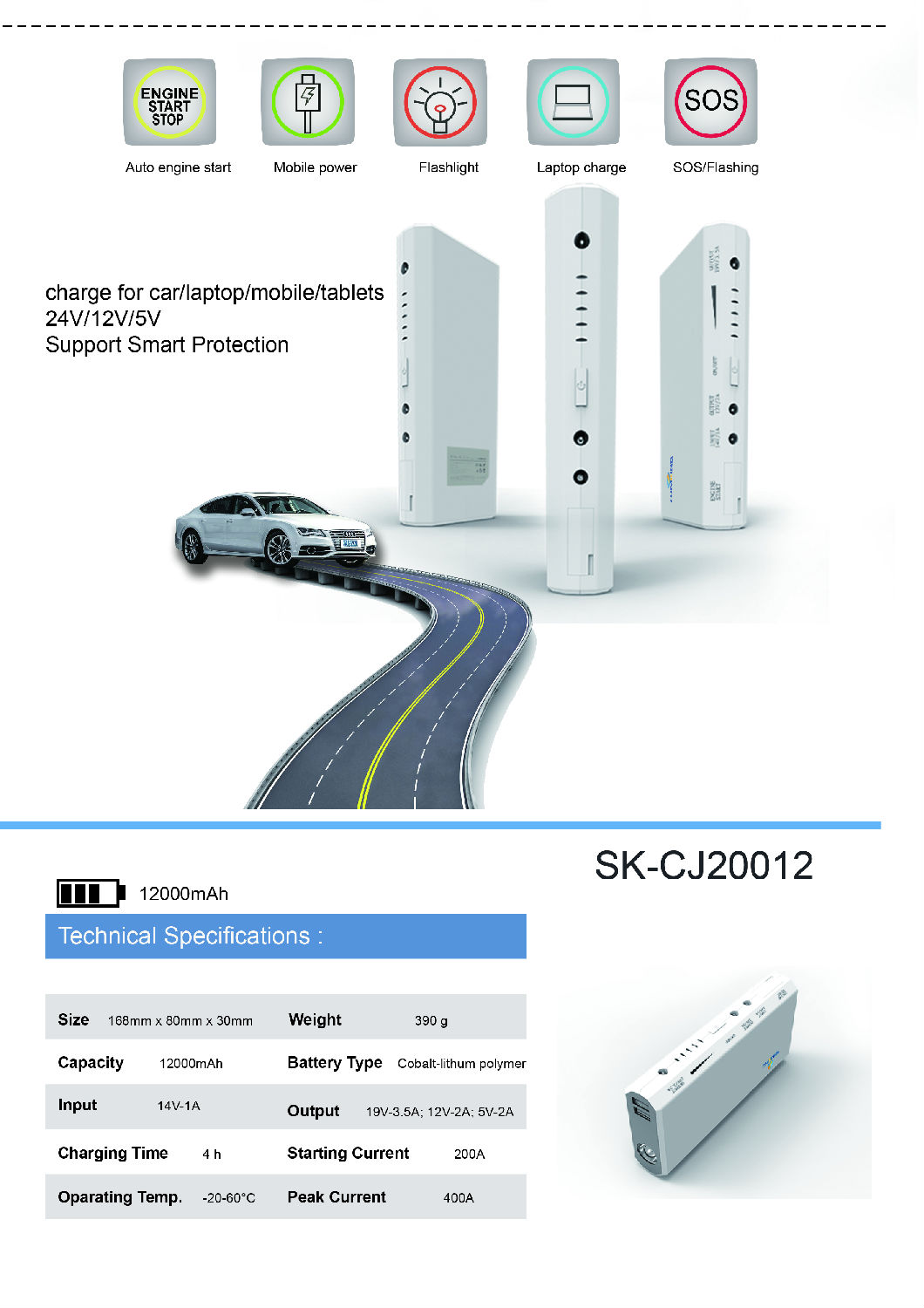 1. Charging for mobile phones and laptops, starting cars, adjustable LED lights (torch, strobe lights and SOS lights).