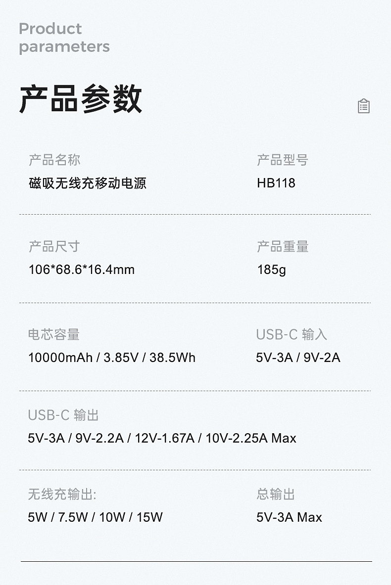 Input  Type-C: DC 5V/3A  9V/2A                                                                     ·Output  Type-C: DC 5V/3A  9V/2.2A   12V/1.67A  10V /2.25A