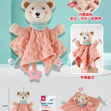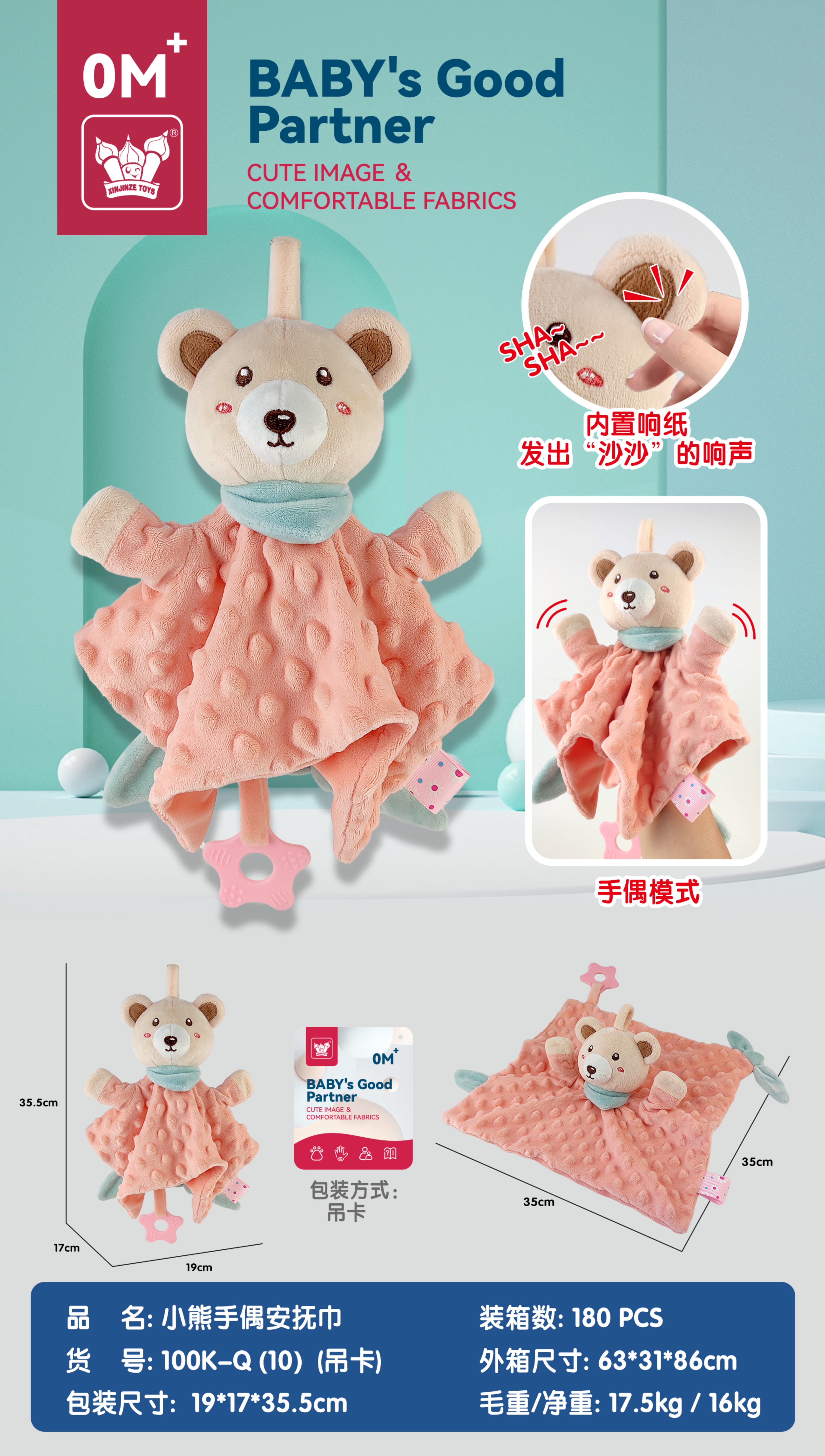 100K-Q(10) BEAR HAND PUPPET COMFORT BLANKET WITH BELL, PRESS-TYPE HORN, WASHABLE, BABY TOY, INFANT COMFORT BLANKET, WASHABLE COMFORT BLANKET