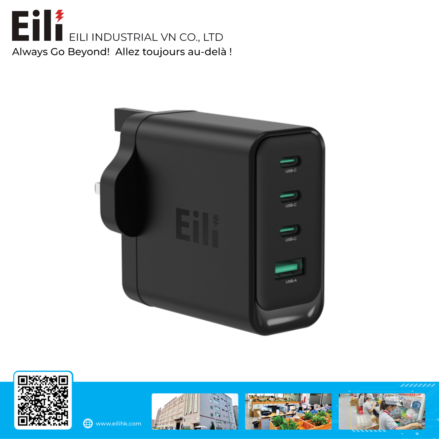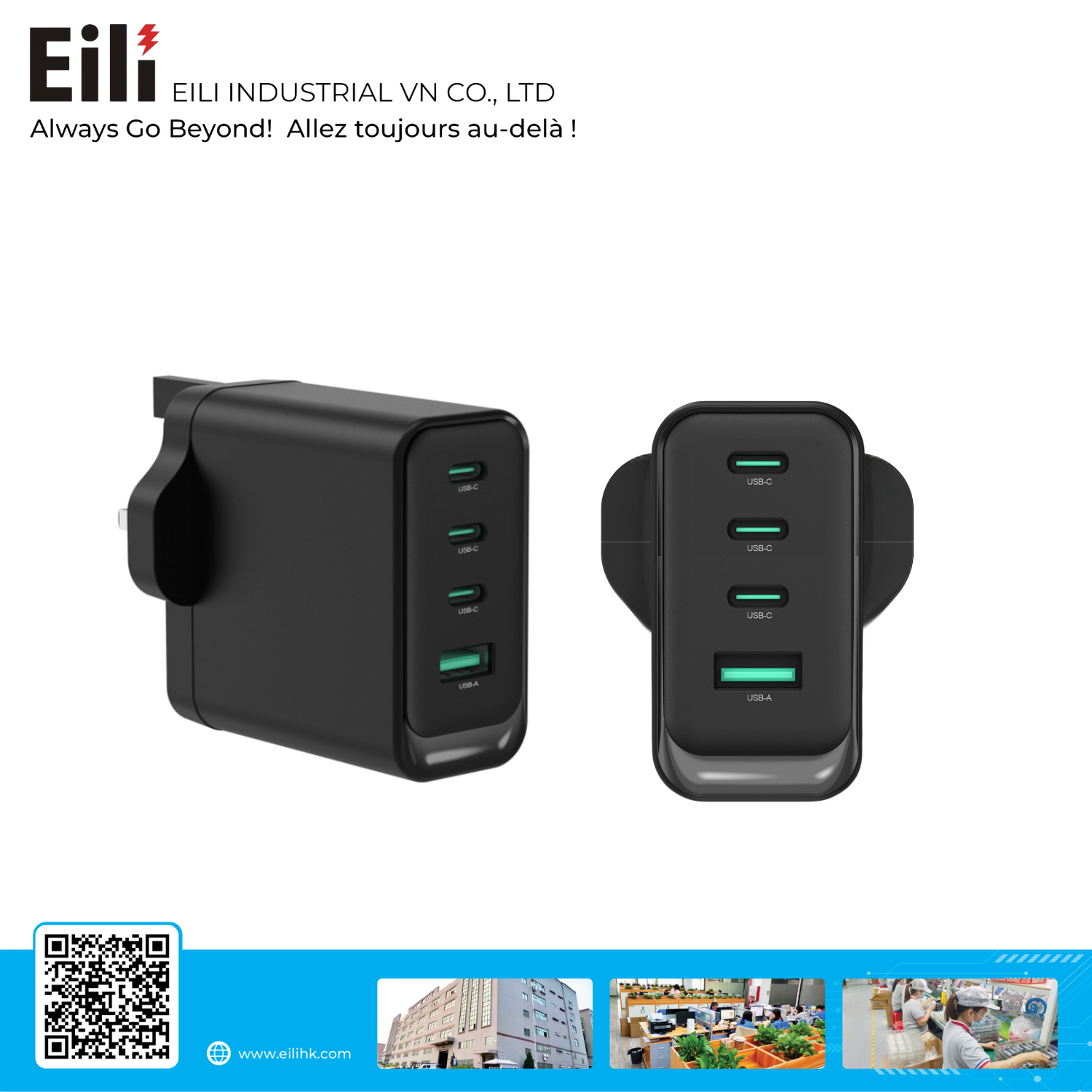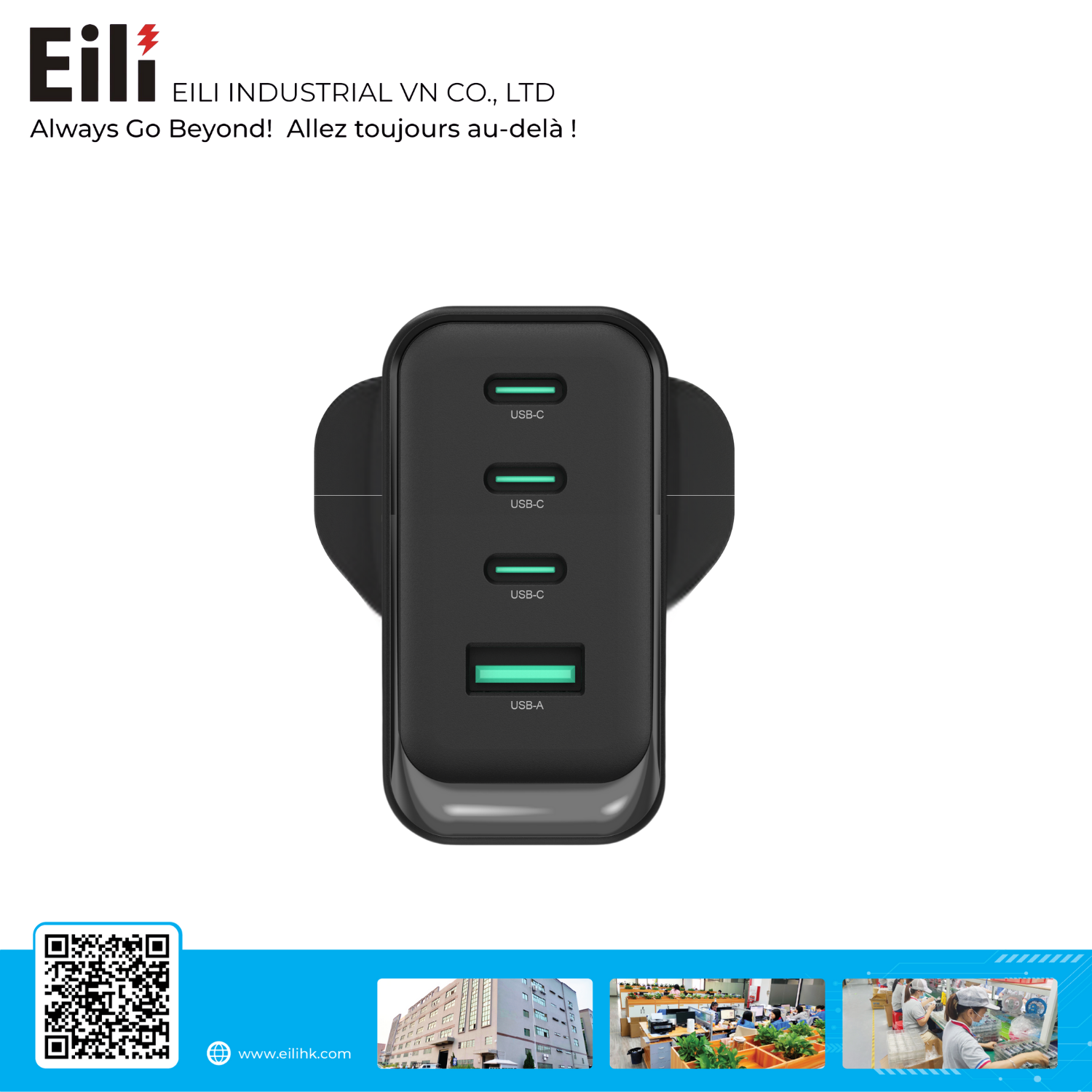 The 100W USB-C Charger with four outputs (3 × USB-C + 1 × USB-A) delivers powerful, efficient, and flexible charging for multiple devices at the same time. Supporting Power Delivery (PD) 3.0 and Quick Charge (QC) protocols, it ensures intelligent power distribution across laptops, tablets, and smartphones. With compact design, robust safety features, and high compatibility, this charger is the perfect solution for office, travel, and everyday use.