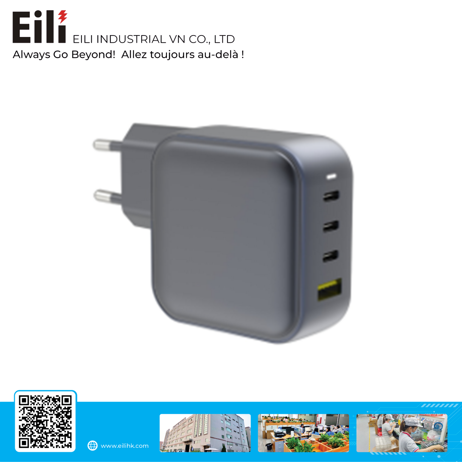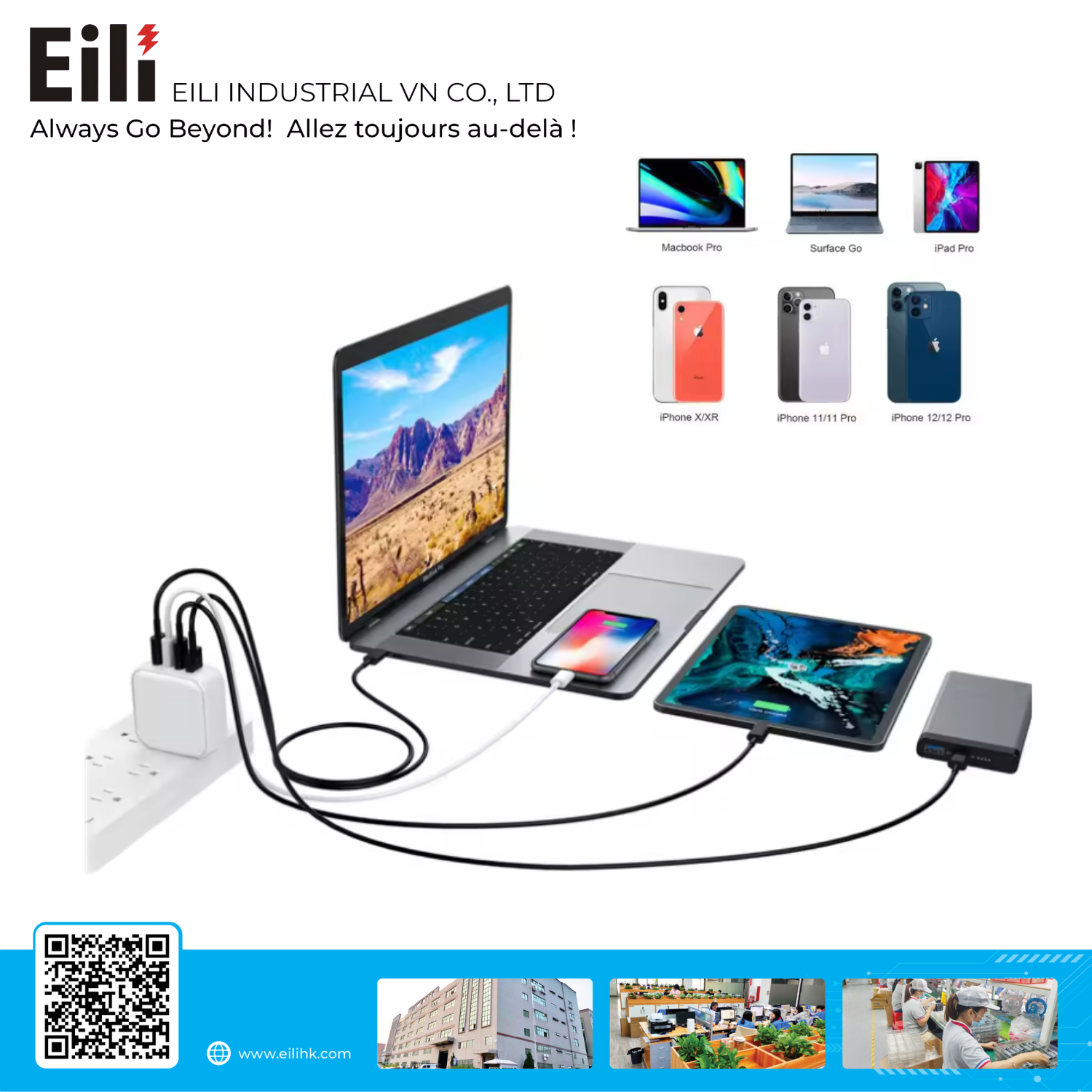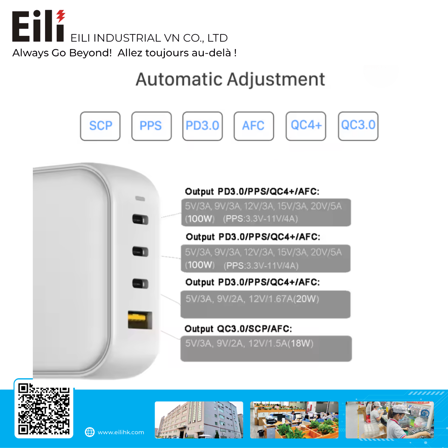 The 100W USB-C Charger with triple USB-C ports and one USB-A port offers powerful and flexible charging for multiple devices at the same time. Supporting Power Delivery (PD) 3.0 and Quick Charge (QC), it delivers fast, intelligent, and safe charging for laptops, tablets, smartphones, and other USB-powered devices. Designed with portability and durability in mind, this charger is perfect for business, travel, and daily use.