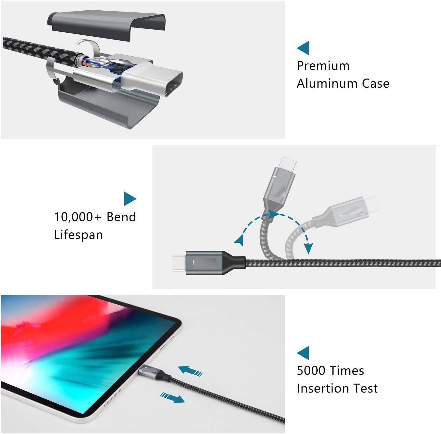 【20V 5A Fast Charging】This cable supports 100W high-speed charging for Type-C smartphone, tablet or laptop like Samsung Galaxy S20/S20 Ultra/Note 10/Note 10 Plus, MacBook, MacBook Pro, Chromebook, iPad Pro 2018,etc. (Note: Charging speeds also depends on your device and charger. Pair your C-Port devices with USB-C Chargers including various 96w 87w 65w 61w 61w 60w 45w 30w 18w USB-C Power Adapters.)