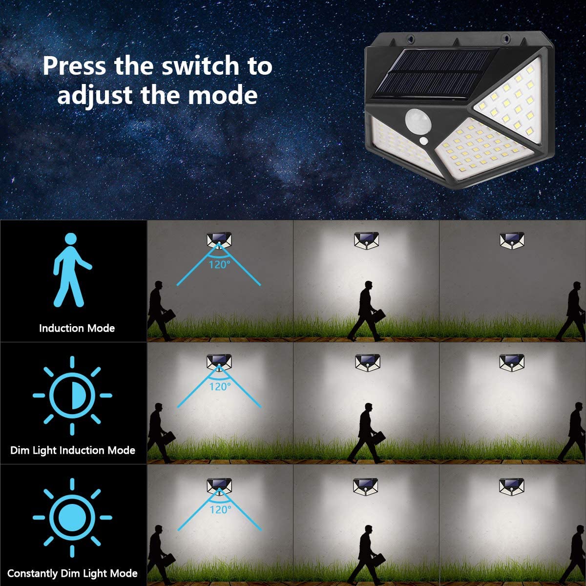 Mode 2: turns on automatically when detects a person at night, and turns to dim light after the person leaves.