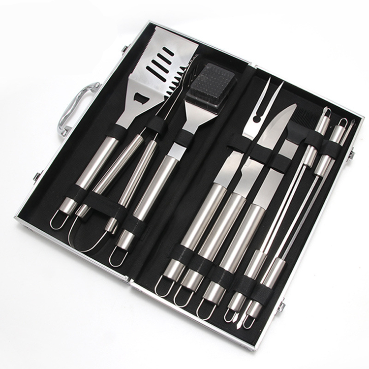 10pcs Stainless steel bbq tools set include spatula,tong,cleaning brush,fork,knife,silicone brush,4pcs skewers