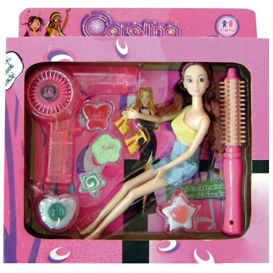 This is a doll with accessories set. The accessories include a comb, toy hair dryer, shoes for the doll, etc. Children can play with the doll by designing different styles for her with the accessories. The doll is pretty and attractive, which children, especially girls will love it immediately.