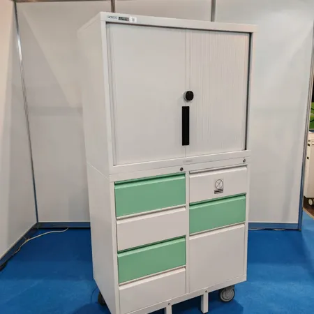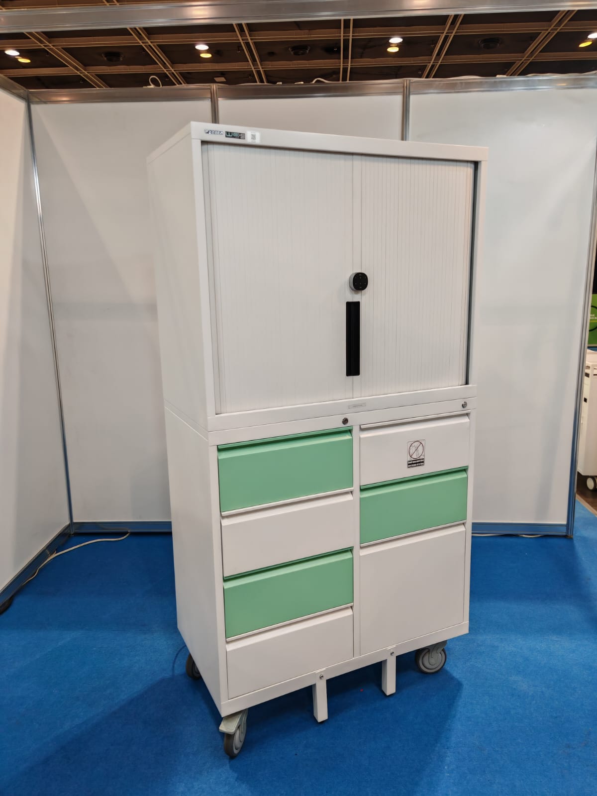 Steel material with White color We+Antimicrobial Protection epoxy powder coating, upper with plastic roller shutter door cabinet with handel and lock, lower with drawerx 7pcs,- 5" Medical Caster, TPR, Anti-bacteria, Static resistance, Low noise, Max loading 120Kg, (Lockable x 2pcs)