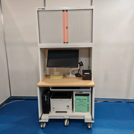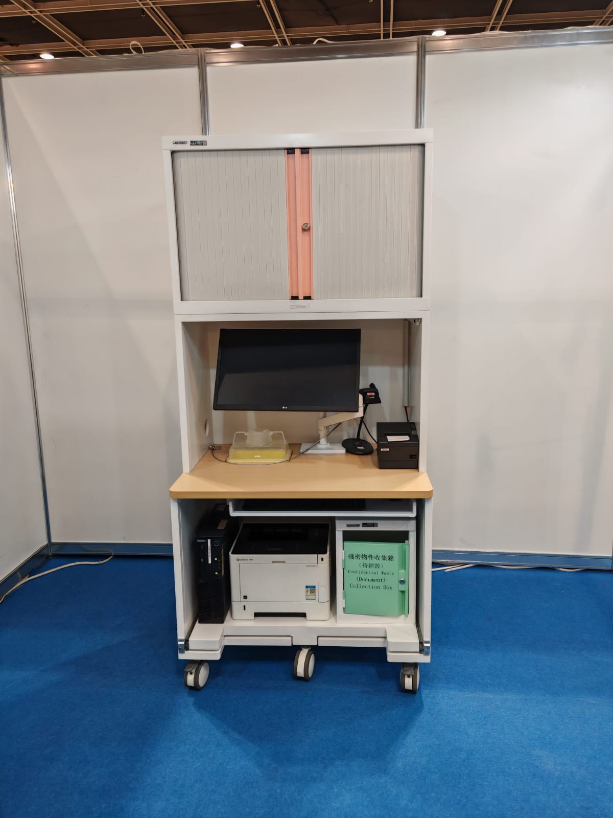 Steel Frame with White Color We+Antimicrobial Protection & Formaldehyde Purification Epoxy Powder Coating, Wooden Top with "Formica" Protect+ Antimicrobial HPL Laminate, Upper Storgae Cabinet with Plastic Shutter Doors, lock & adjustable Shelf, LED Light ,"Ergotron" LX White Color Monitor Arm x 1, Under Desk Sliding Printer Tray x 1 Set, 4" Medical Casters x 5pcs, TPR, Anti-bacteria, Static resistance, Low noise, Max loading 80Kg, (Lockable x 2pcs)