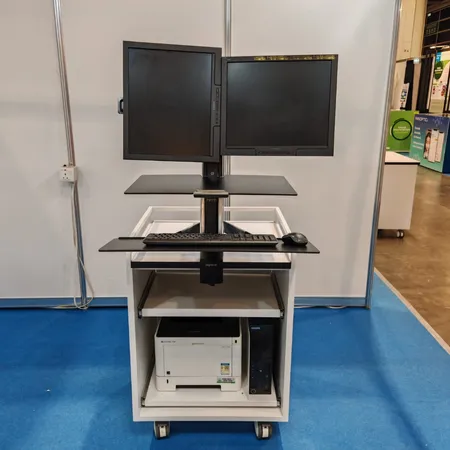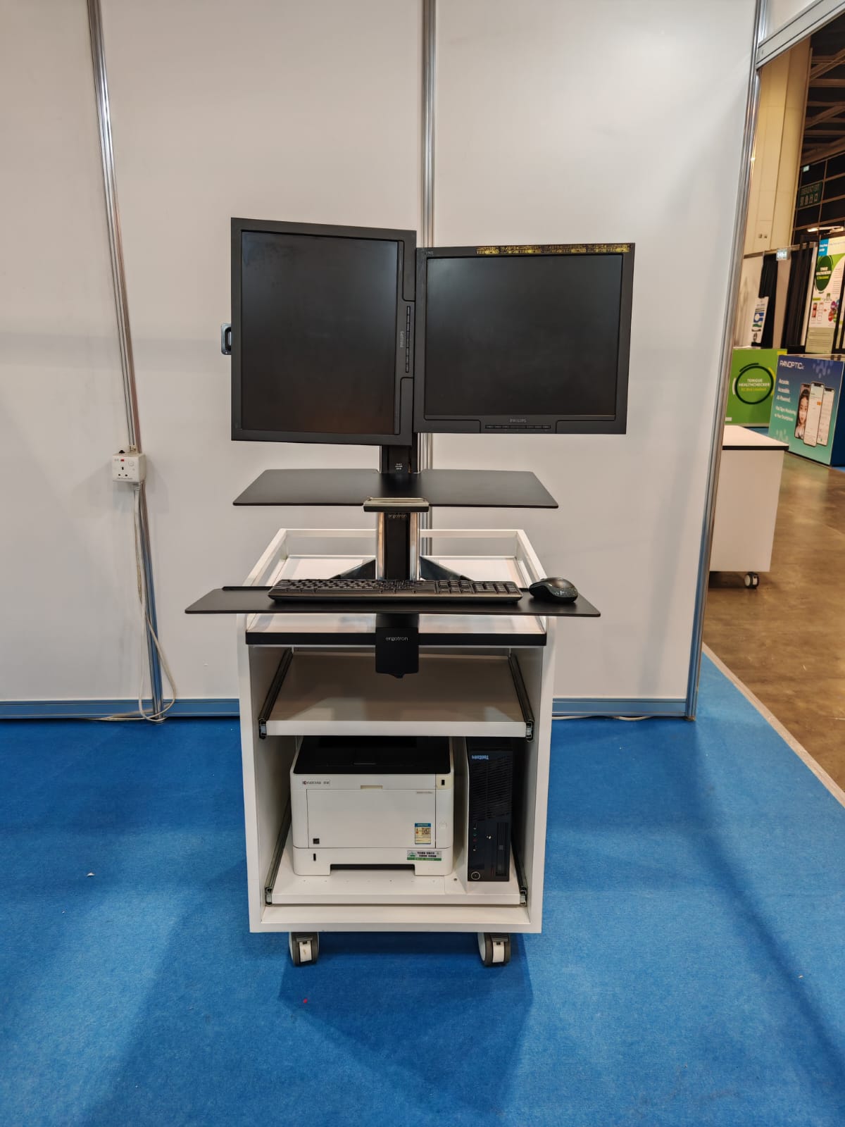 Steel Frame Steel Material with White Color We+ Antimicrobial Protection & Formaldehyde Purification Epoxy Powder Coating, Wooden Material with "Formica" Protect+ Antimicrobial HPL Laminate. Ergotron LX single Sit-Stand monitor arm x 1pc (5 Years Warranty), Trolley with one Year Warranty, 4”Medical Casters, TPR, Anti-bacteria, Static resistance, Low noise, Max loading 80Kg, (Lockable x 2pcs)