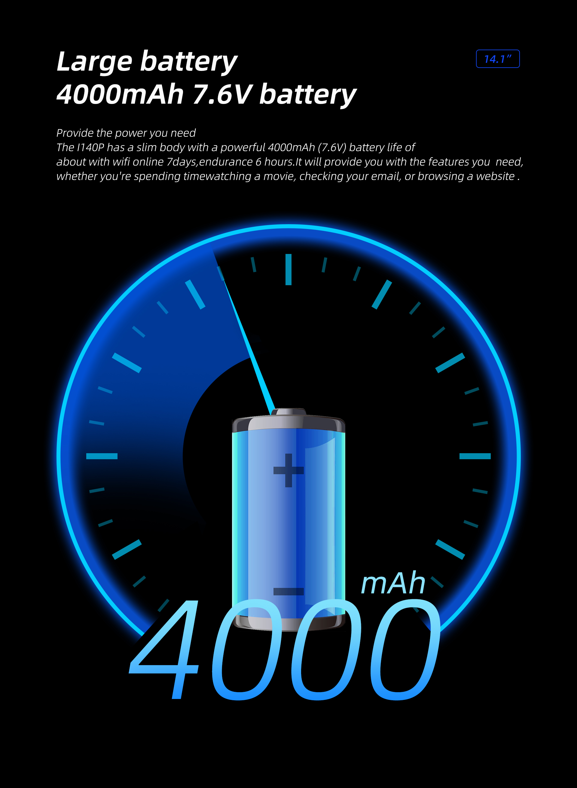 | 耐力: | 视情况而定,wifi在线时约7天,续航时间5~6小时。 | |