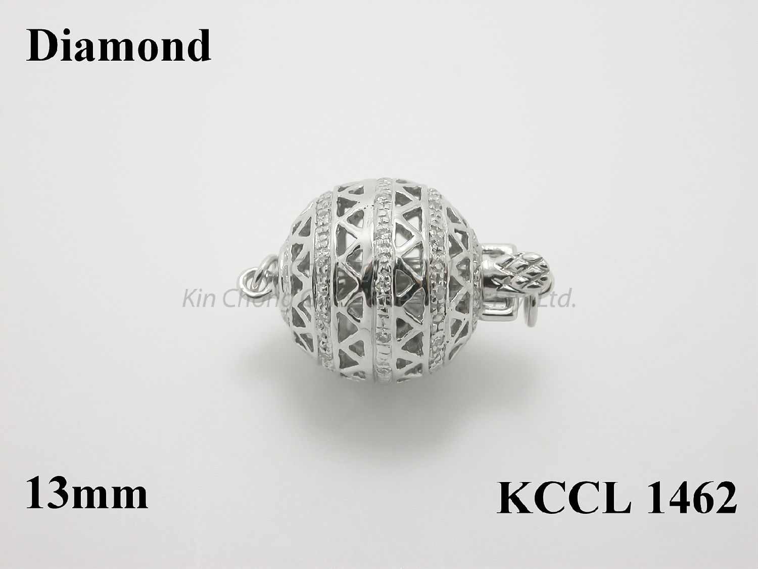 Highlighted here is a bracelet clasp which is delicately constructed with precious 14K gold and shimmering round diamonds. This shiny silvery ball features a sleek perforated surface. Crafted with refined details, the all-over triangular cutouts lend a unique brilliance to your high-value jewelry.