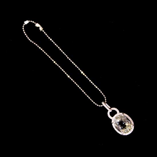 The admirable ladies' pendant bestows a simple oval-shaped design, which is finely sculpted with top-grade 14K fine gold for a sparkling appearance. The whole piece reveals meticulous craftsmanship with the arrangement of twinkling diamonds. The lustrous, pure-green amethyst stone in the middle adds a final touch to perfect this irresistibly beautiful pendant.