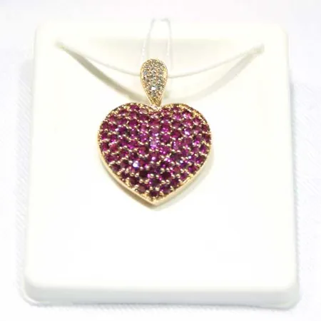 The dainty ladies' pendant takes your breath away with the romantic heart-shaped design. The 14K rose gold setting is embraced luxuriously with the sparkling loose diamonds, which radiate an enchanting glow of sophistication with glamor. Perfected with pink sapphire stones, this ladies' heart-shaped pendant melts your heart instantly at the first glance.