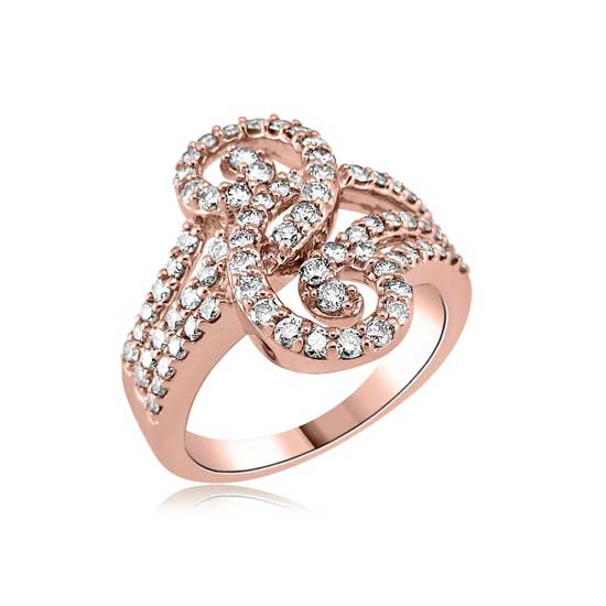 This is a gorgeous finger ring that is made of 14-karat rose gold. It features an appealing swirl appearance. The allover dazzling diamonds in natural white add a touch of luxuriousness to the whole piece.