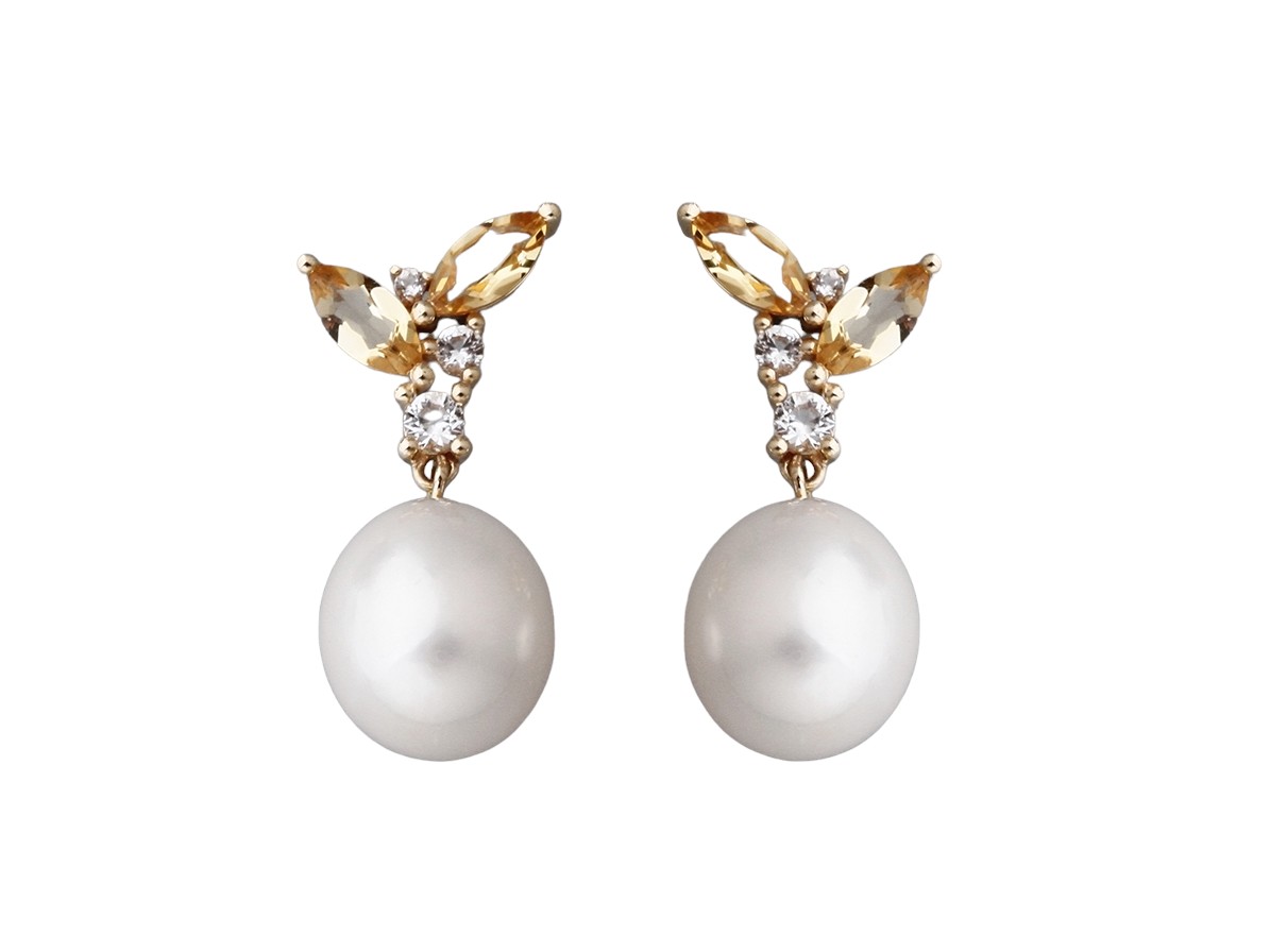 14K YELLOW GOLD EARRINGS WITH CITRINE AND WHITE TOPAZ, AND 9.5-10MM DROP SHAPE FRESHWATER PEARL