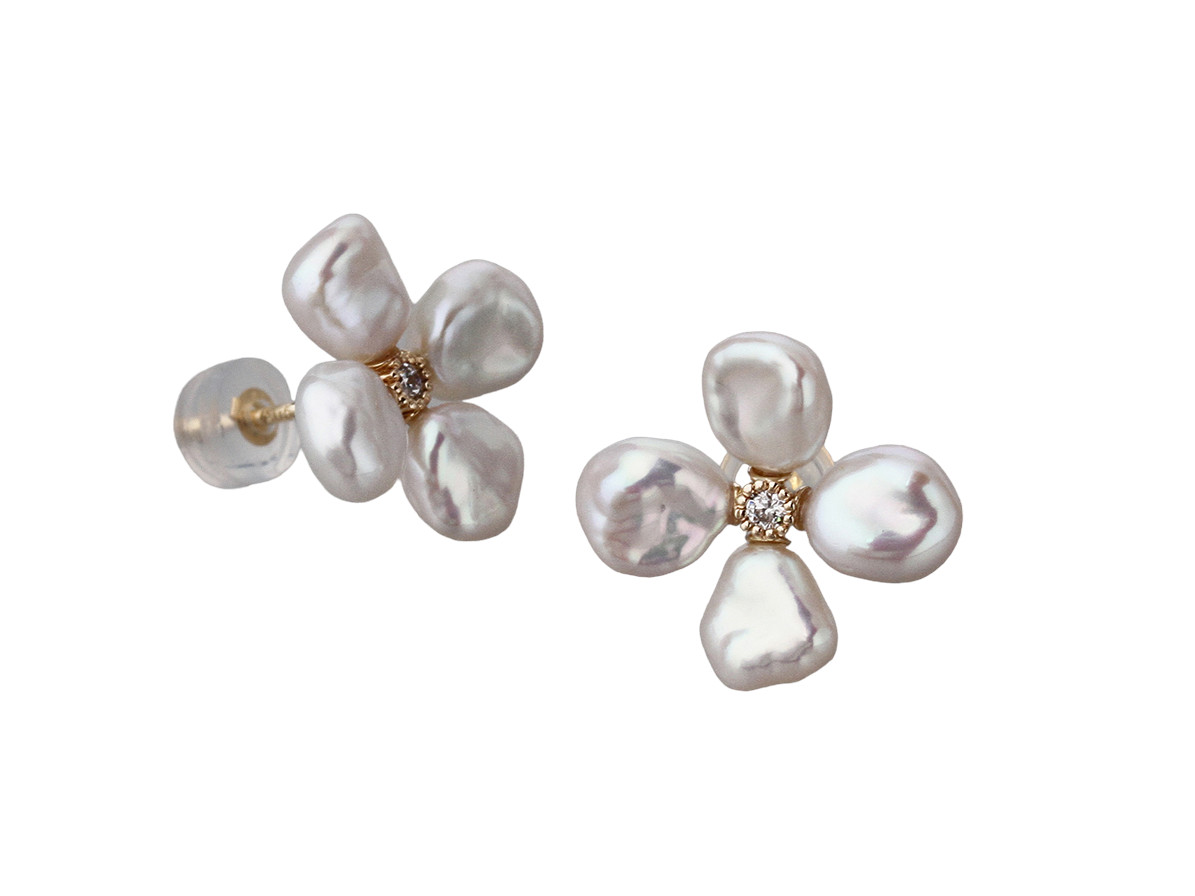14K YELLOW GOLD EARRINGS WITH 6-7MM KESHI FRESHWATER PEARL AND DIAMOND, WITH SILICON EAR BACK