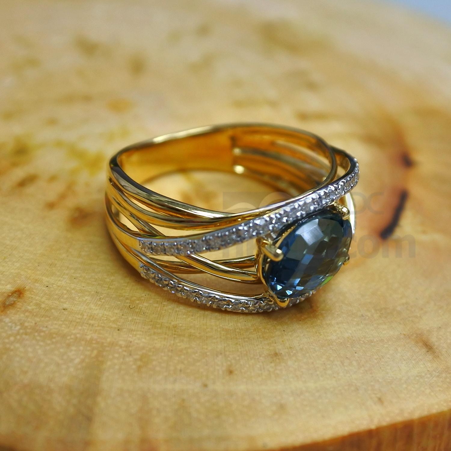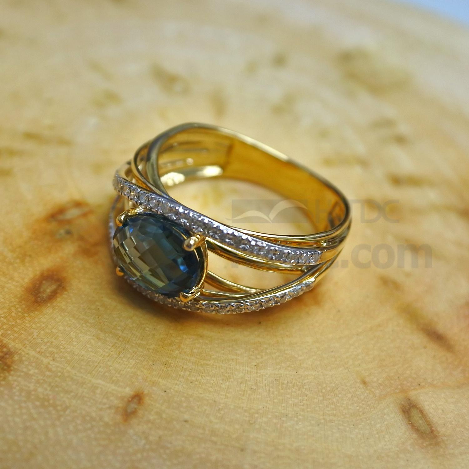 • Yellow gold ring set with London blue Topaz 7x9mm, white diamonds TW 0.161CT