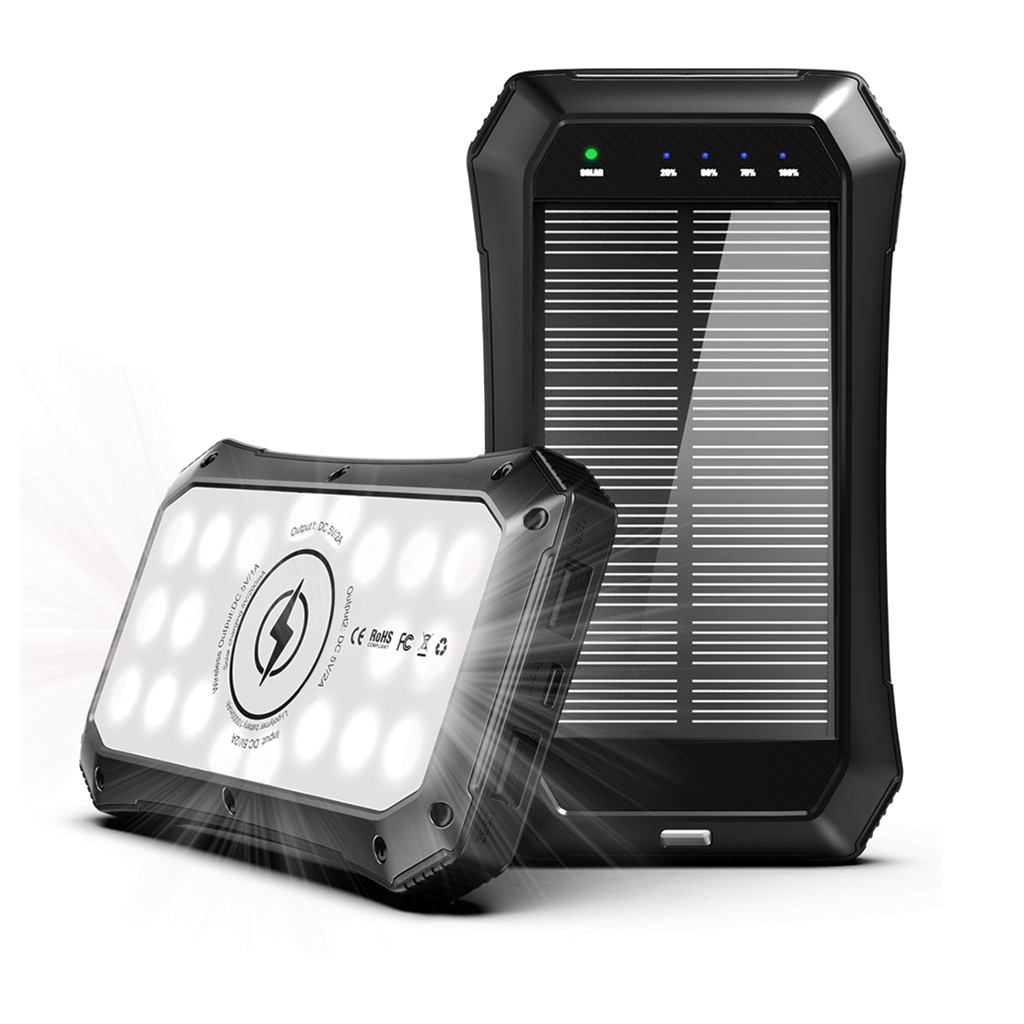 15,000 mAh Wireless Solar Power Bank with 20 LEDs includes the following features :
