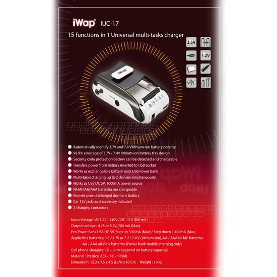 Showcased is a universal charger that is designed with 15 functions. It charges your USB powered devices, batteries and serves as a power bank. It also supports charging two devices simultaneously for users' convenience.