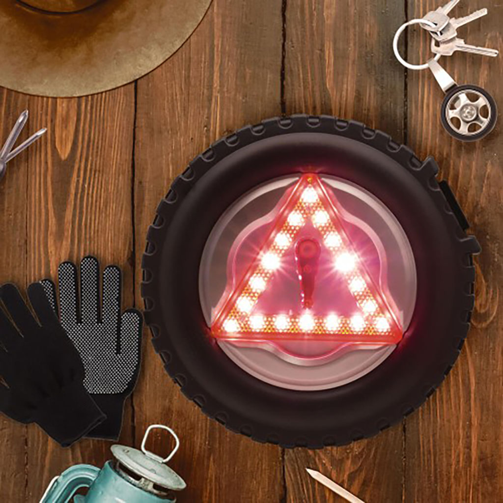 Features a tire-shaped toolbox with 19 Red LED flash alert alarm, working reach 90 decibels, allows easy access to all tools at once while keeping tools clean and organized