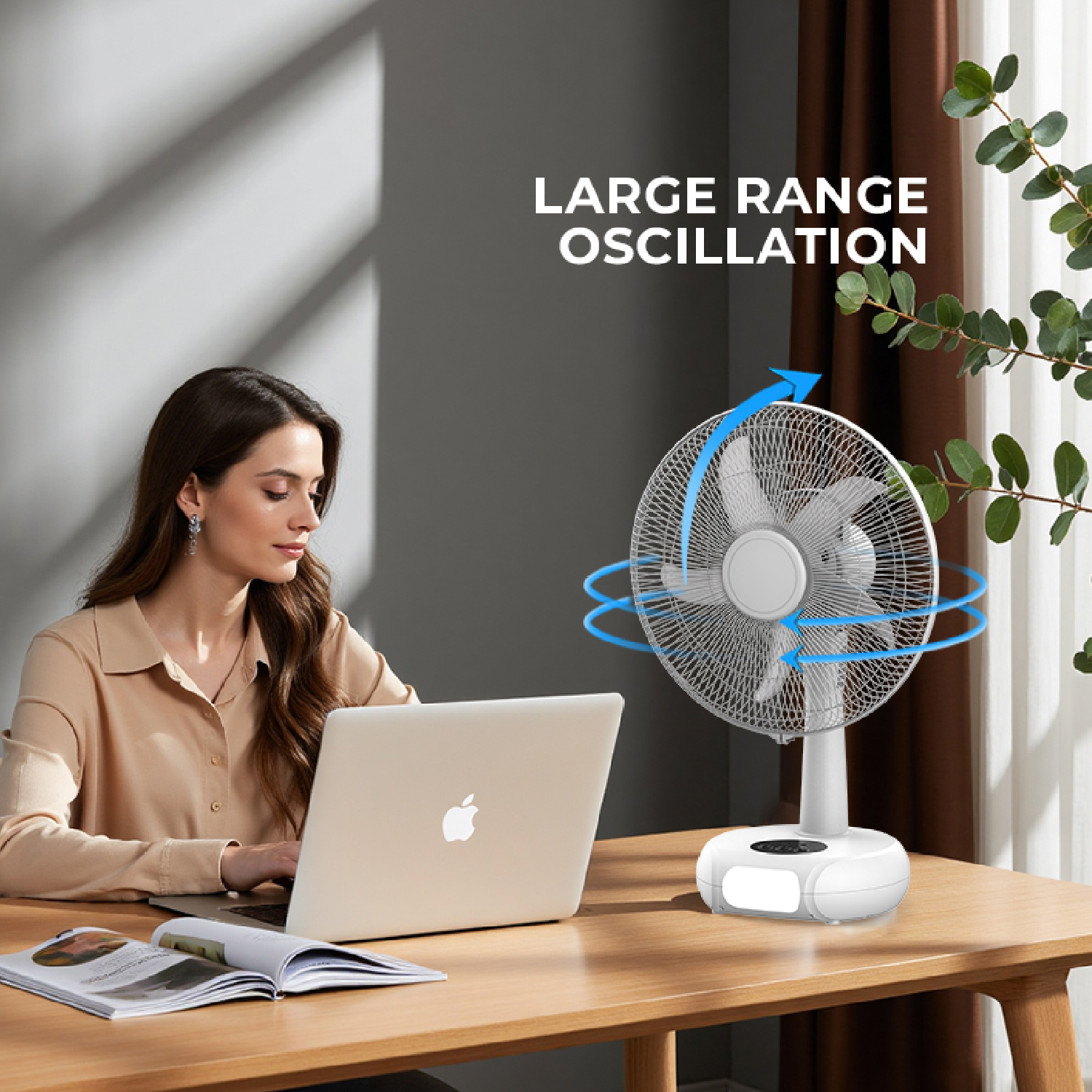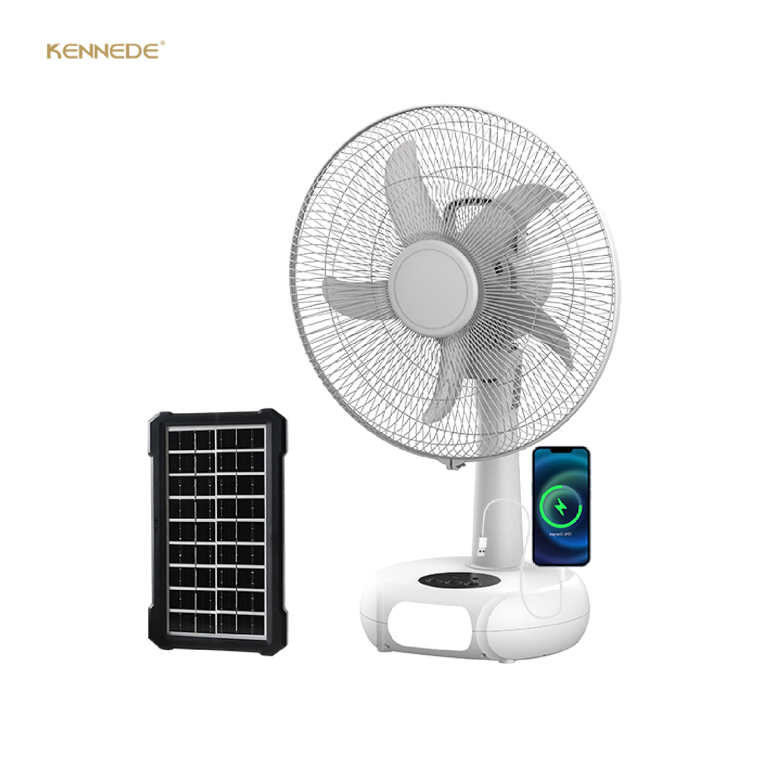 The KN-5226B is a 16-inch rechargeable table fan designed for versatile use with multiple power options and convenient features.