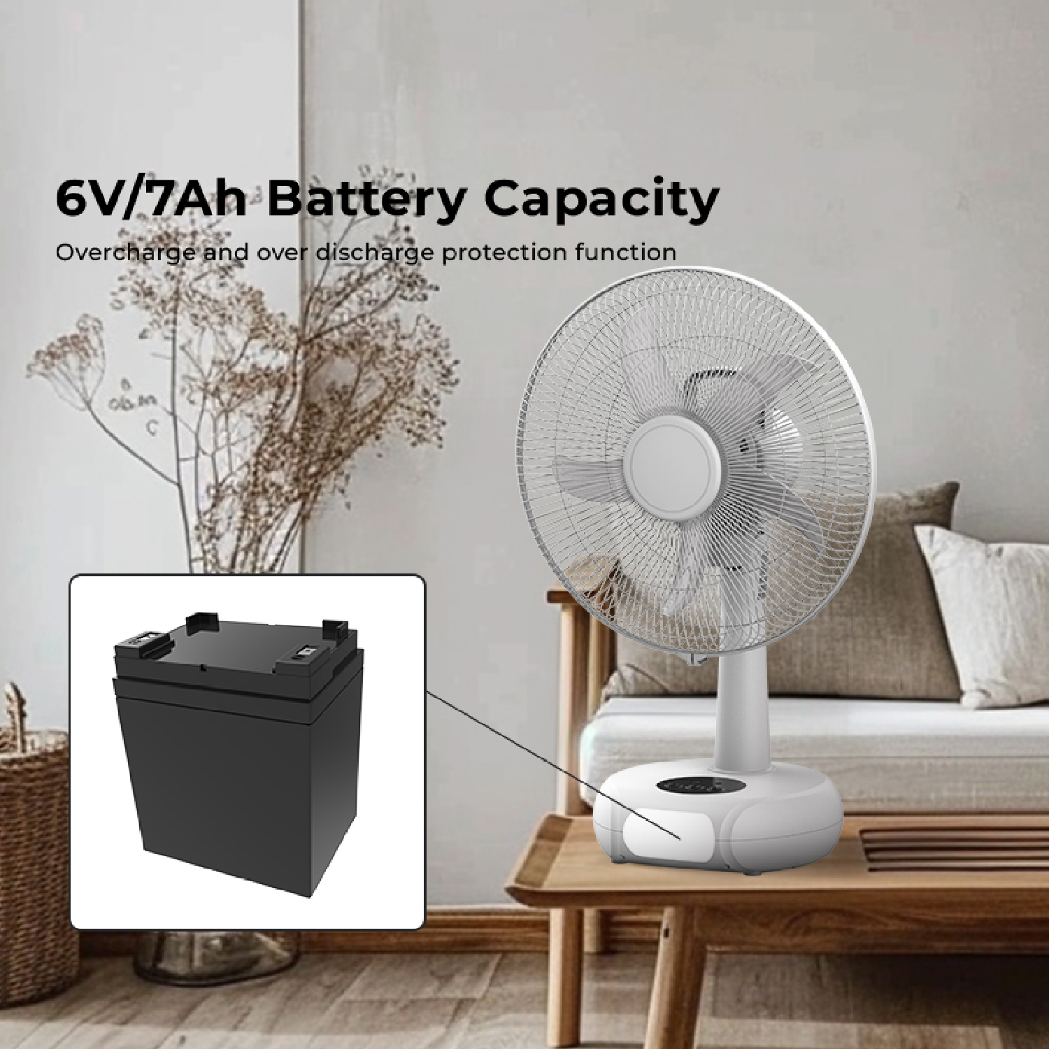 • Battery: One 6V / 7Ah rechargeable battery with overcharge and over-discharge protection.