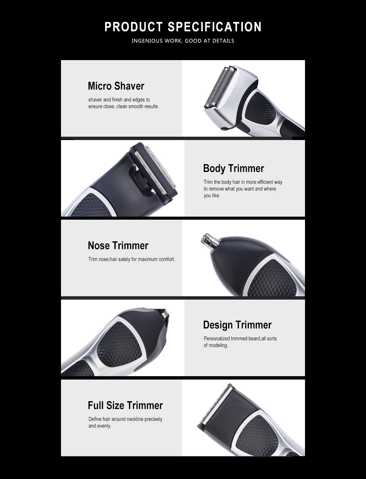 • Full size trimmer, precision trimmer, micro shaver and nose trimmer,design trimmer.