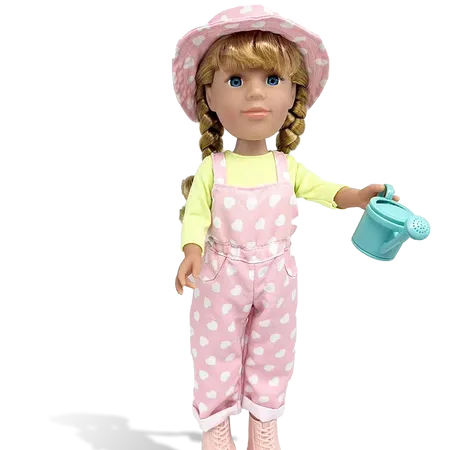 The daily life of a young girl. Put on a denim apron to water your garden on a sunny morning, but girls need to be aware of the sun, so wear a sun hat!