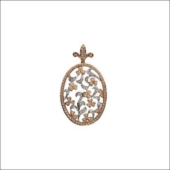 • Bezel set round diamonds on rose gold flowers and white gold leaves patterns in open work setting.